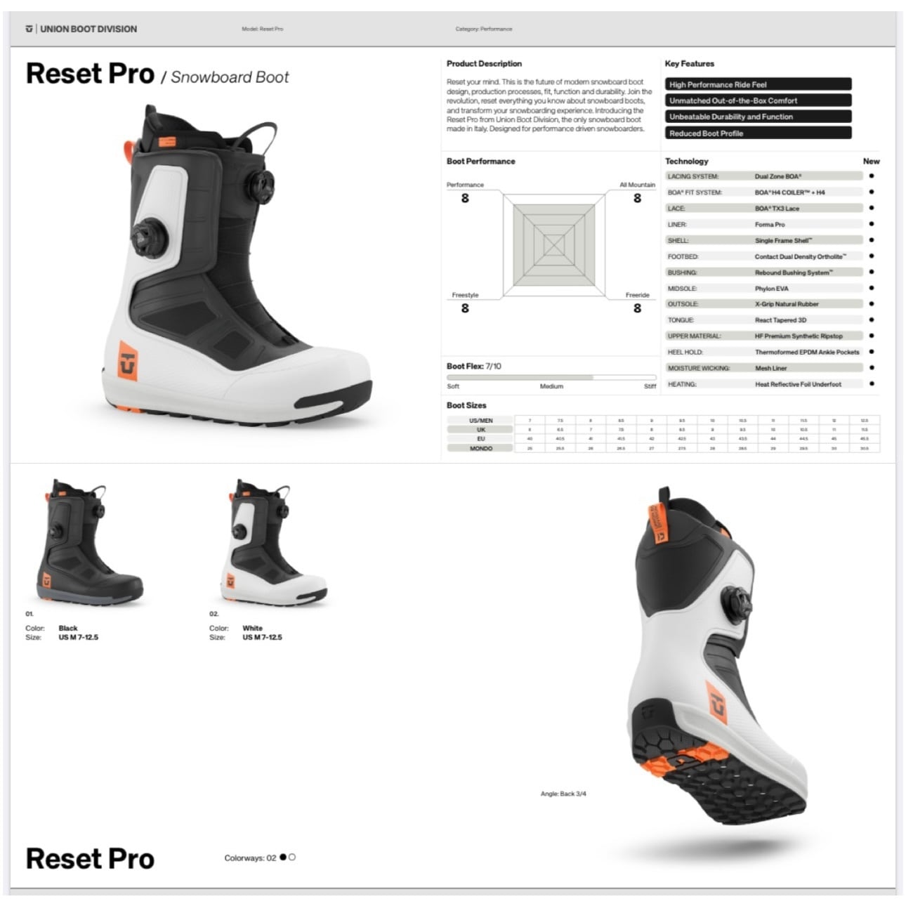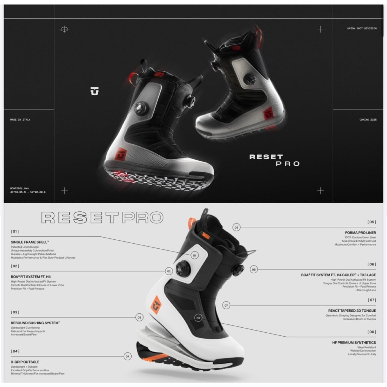 Union Boot DivisionのReset Proは、スノーボードブーツのデザイン、製造プロセス、フィット感、機能性、耐久性において新たな未来を提示しています。これまでの常識を一新し、スノーボード体験を変革するブーツとして登場。Reset Proは、イタリア製で、パフォーマンス重視のスノーボーダー向けに設計されています。