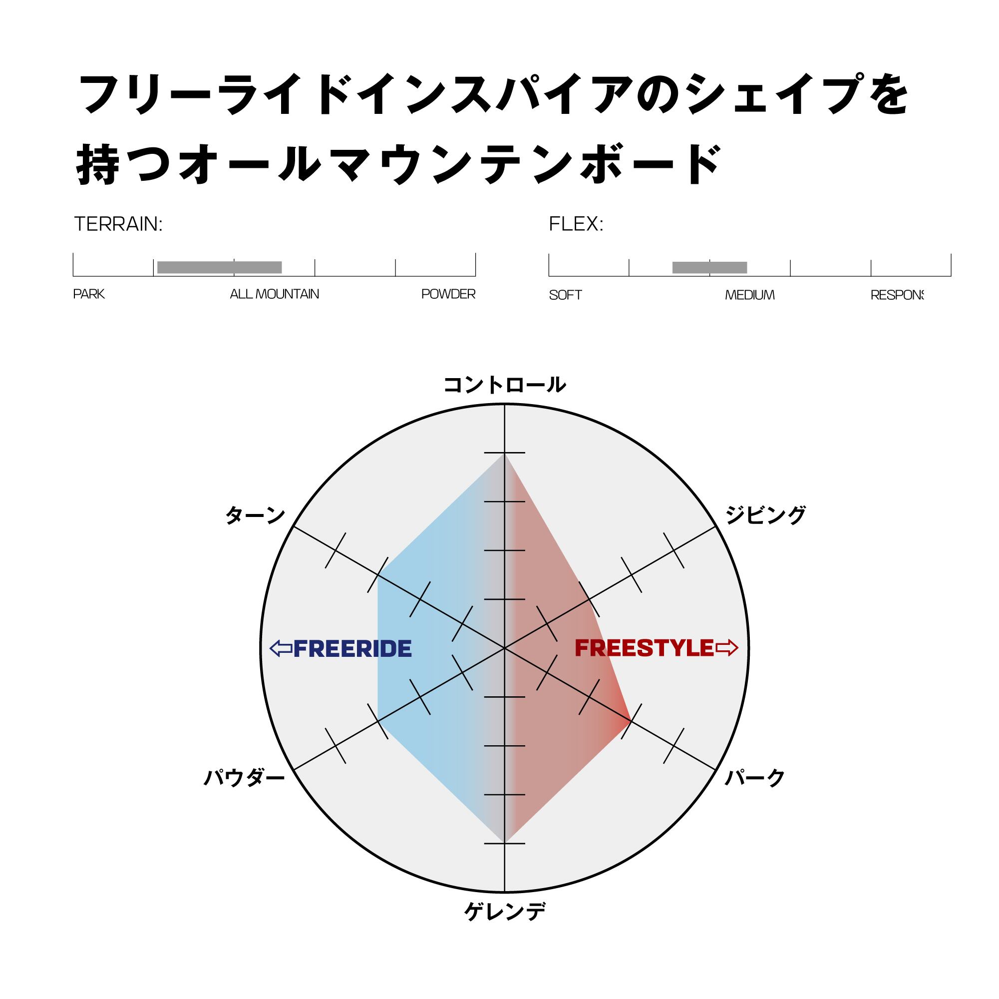 バインディングの内側をキャンバー構造にすることで、反発力とランディングでの安定感を実現し、バインディングの外側をロッカー構造にすることで浮力を得た、滑り方を選ばない構造。