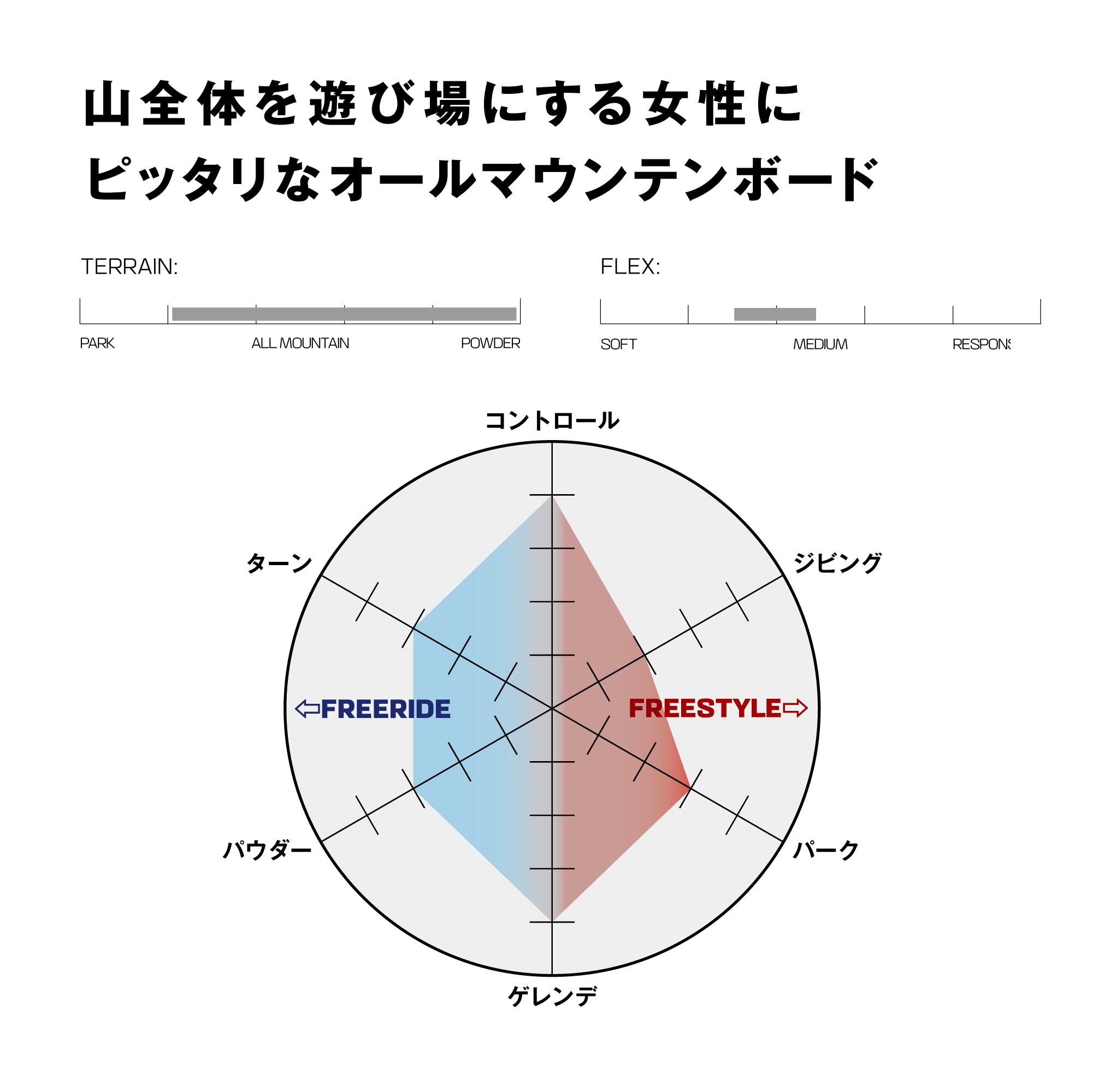 ◇ Blissは山全体を遊び場にする女性にピッタリなフリーライドにインスパイアされたシェイプを持つオールマウンテンボードです。テーパードディレクショナルシェイプがターンの感動と浮力を、クロスプロファイルキャンバーがグルーマーでの安定性を提供します。エコフレンドリーなコルクレールとリサイクル素材を採用し、環境への負荷を軽減しながらスムーズな乗り味を実現しました。