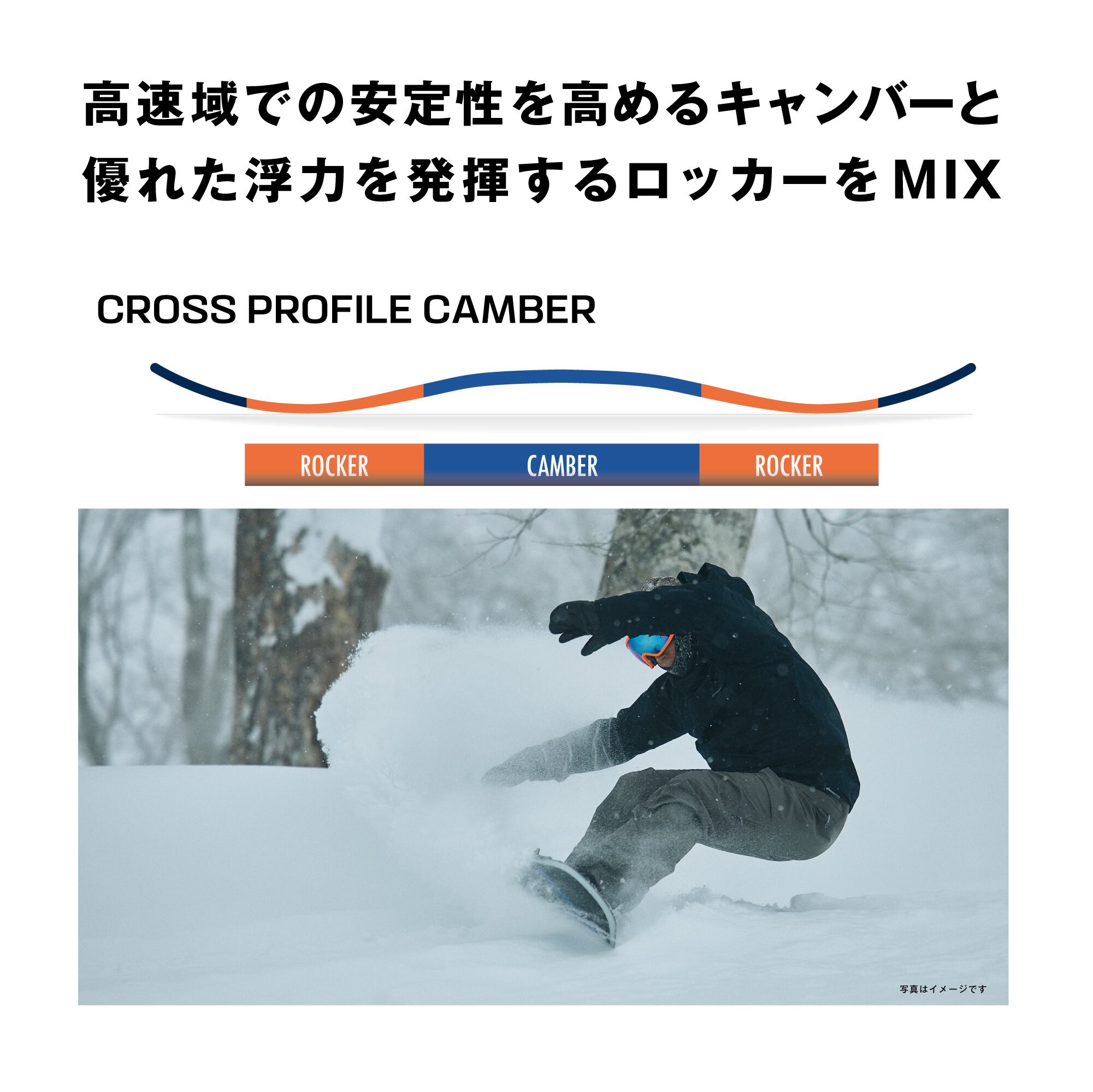 ◇ クロスプロファイルキャンバーは高速域での安定性を高める為、ボードの大部分にキャンバーゾーンを採用しつつ、ノーズとテールにロッカーゾーンを採用することで、より優れた浮力を提供します。