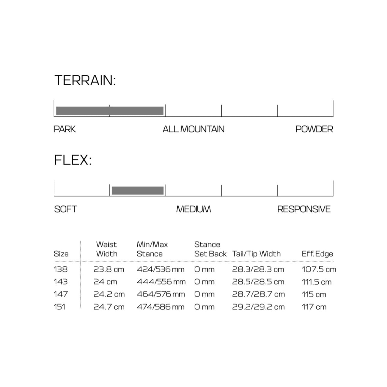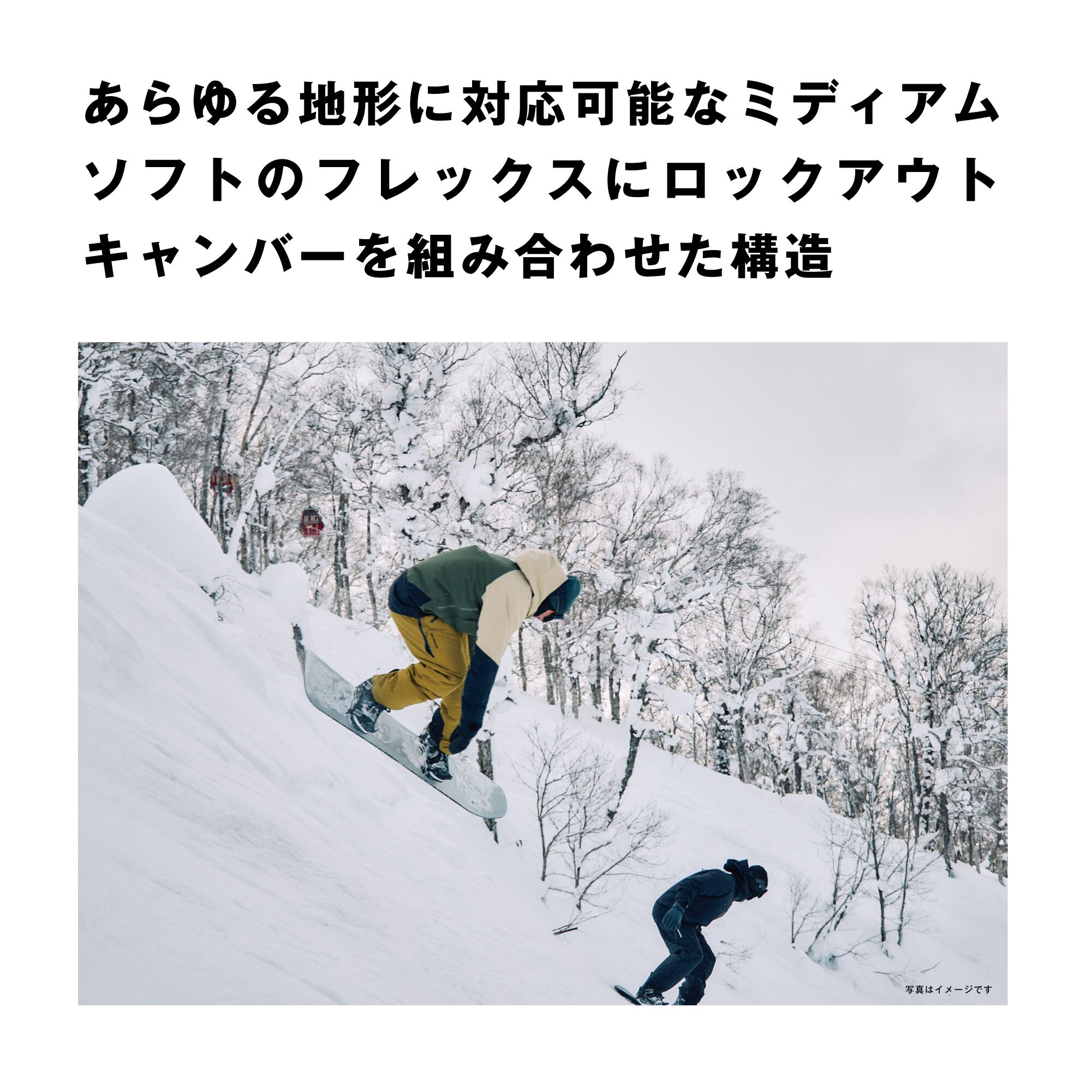 ◇ ロックアウトキャンバーは両足間のフラットゾーンがジャンプやレールのアプローチをサポート。足元のキャンバーゾーンが安定性と、ノーズとテールのロッカーゾーンがプレスのしすさを提供します。