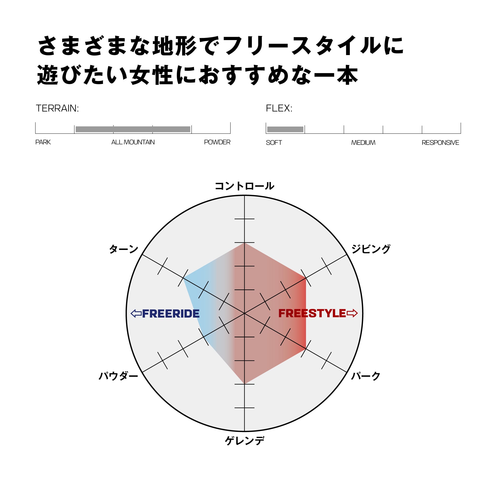 ◇ REFLECT WOMENは見た目のクールさもさることながら、乗ったその日から上達に導くフラットアウトキャンバーシェイプやバイトフリーエッジを搭載しているので転ぶ回数も減るかもしれない。様々な地形でフリースタイルな遊びを取り入れたい女性に手にしてもらいたい一本となっています。