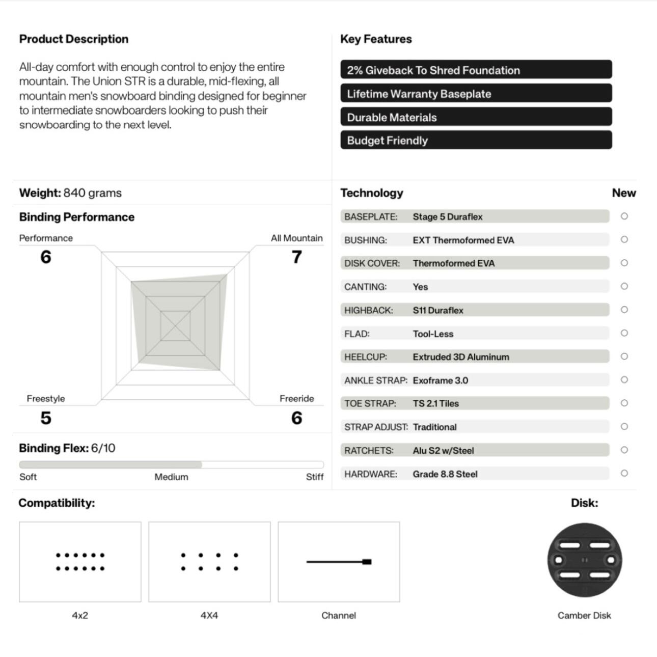 この「Union STR」は、耐久性が高く、ミドルフレックスのオールマウンテン向けバインディング。
