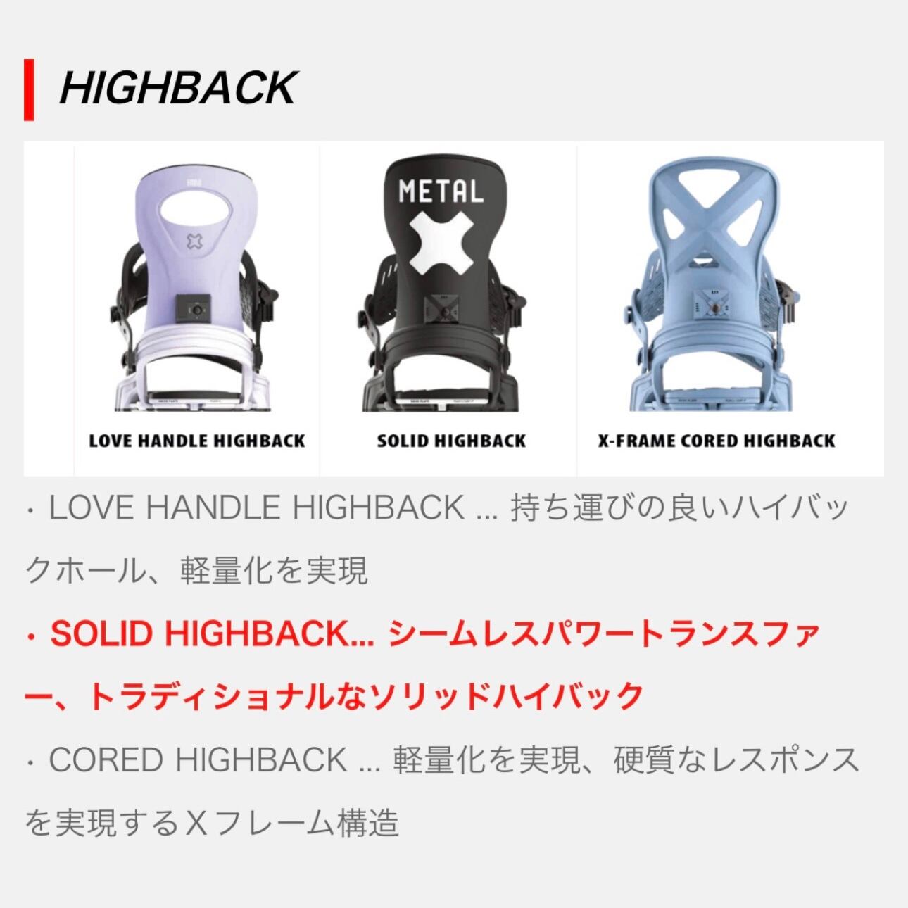 チームライダーが主導でパフォーマンスを向上させたオールマウンテン用モデルです。ソフトコンプレッションウィンドウパワーバンドを備えたアンクルストラップが特徴でブーツに馴染みパワー伝達と快適性を一日中提供してくれます。マグネシウムファイバーをラミネートした軽量でレスポンシブ、そしてカントとショックパッドが付いたドライブプレート、そして剛性を高めるためソリッドアシンメトリーハイバックを搭載しました。