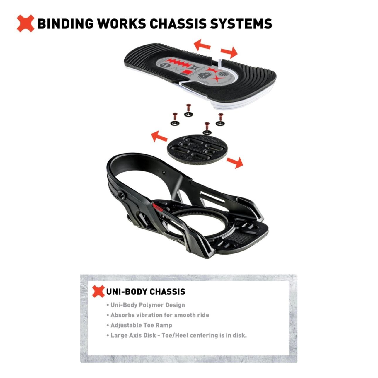 チームライダーが主導でパフォーマンスを向上させたオールマウンテン用モデルです。ソフトコンプレッションウィンドウパワーバンドを備えたアンクルストラップが特徴でブーツに馴染みパワー伝達と快適性を一日中提供してくれます。マグネシウムファイバーをラミネートした軽量でレスポンシブ、そしてカントとショックパッドが付いたドライブプレート、そして剛性を高めるためソリッドアシンメトリーハイバックを搭載しました。