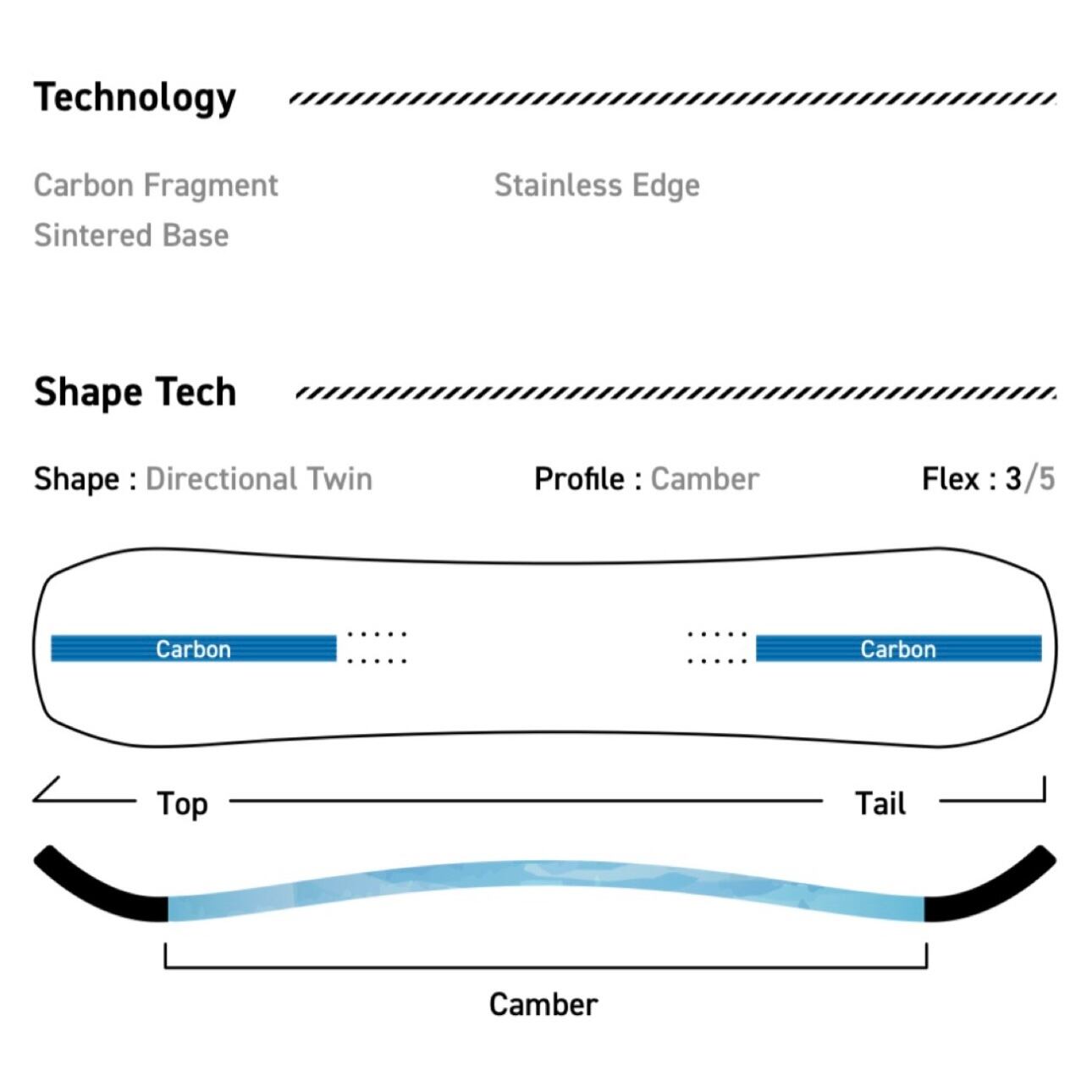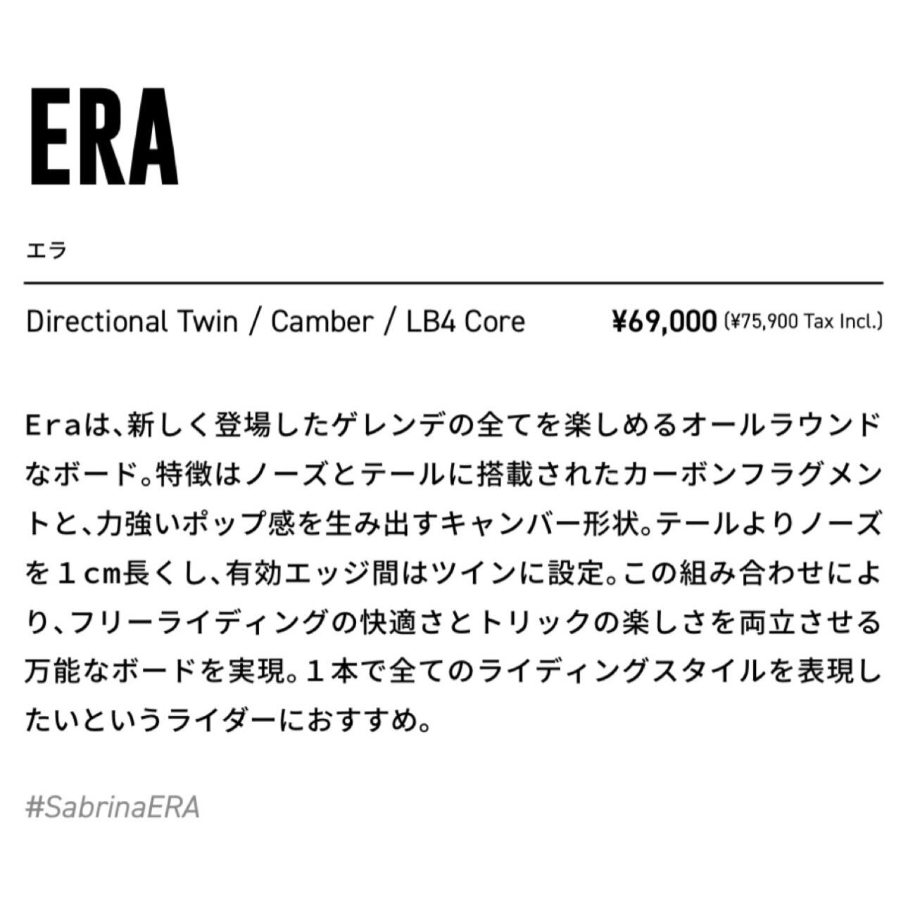 Eraは、新しく登場したゲレンデの全てを楽しめるオールラウンドなボード。特徴はノーズとテールに搭載されたカーボンフラグメントと、力強いポップ感を生み出すキャンバー形状。テールよりノーズを1cm長くし、有効エッジ間はツインに設定。この組み合わせによ