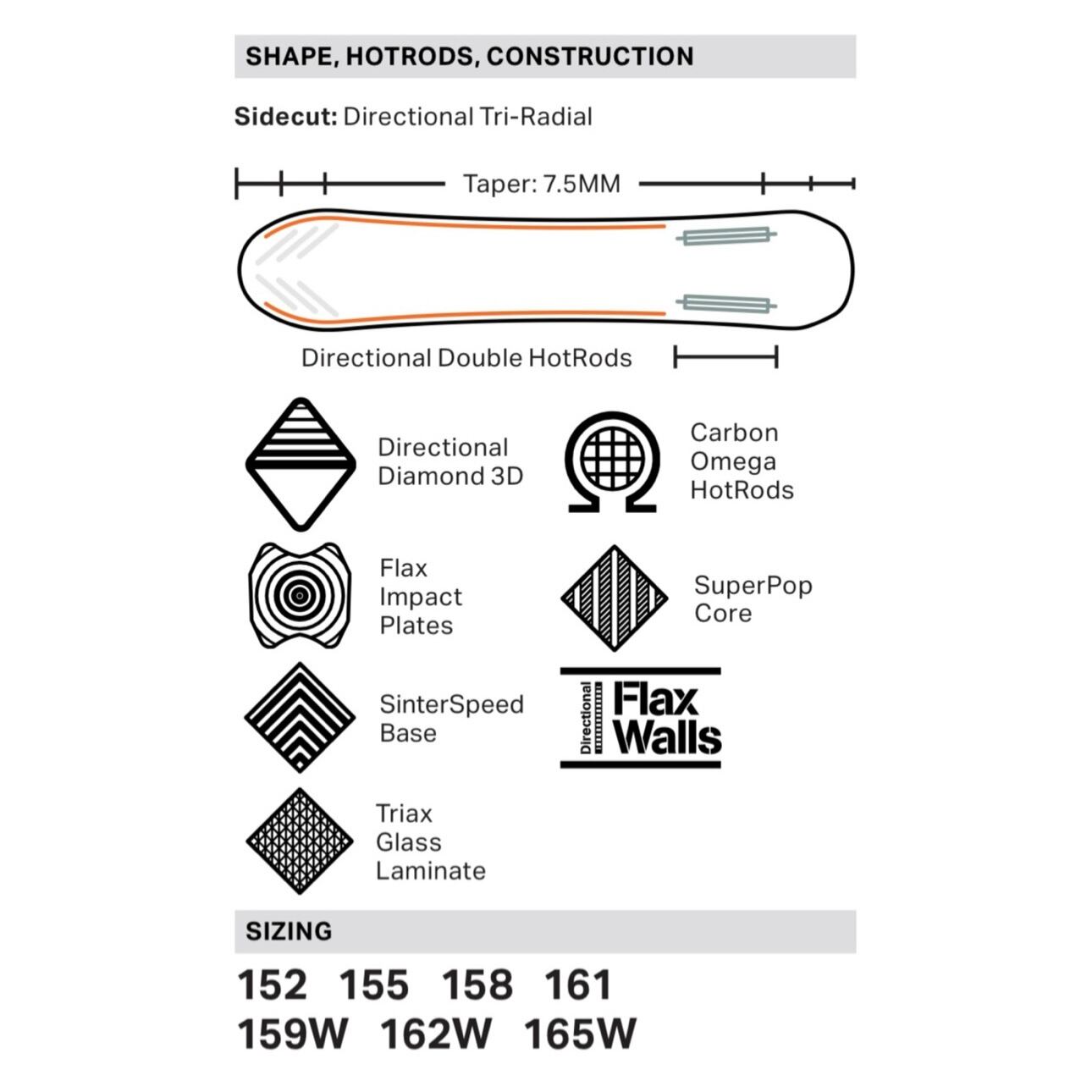 ノーズのみ施されたディレクショナル・ダイアモンド3DはRomeのディレクショナル・ボードに採用され、ディープスノーで浮遊感をもたらし、長くスムーズなターンを決めさせる。パウダーでの最高のパフォーマンスとともに、圧雪されたゲレンデで信頼感を得られるデザイン。