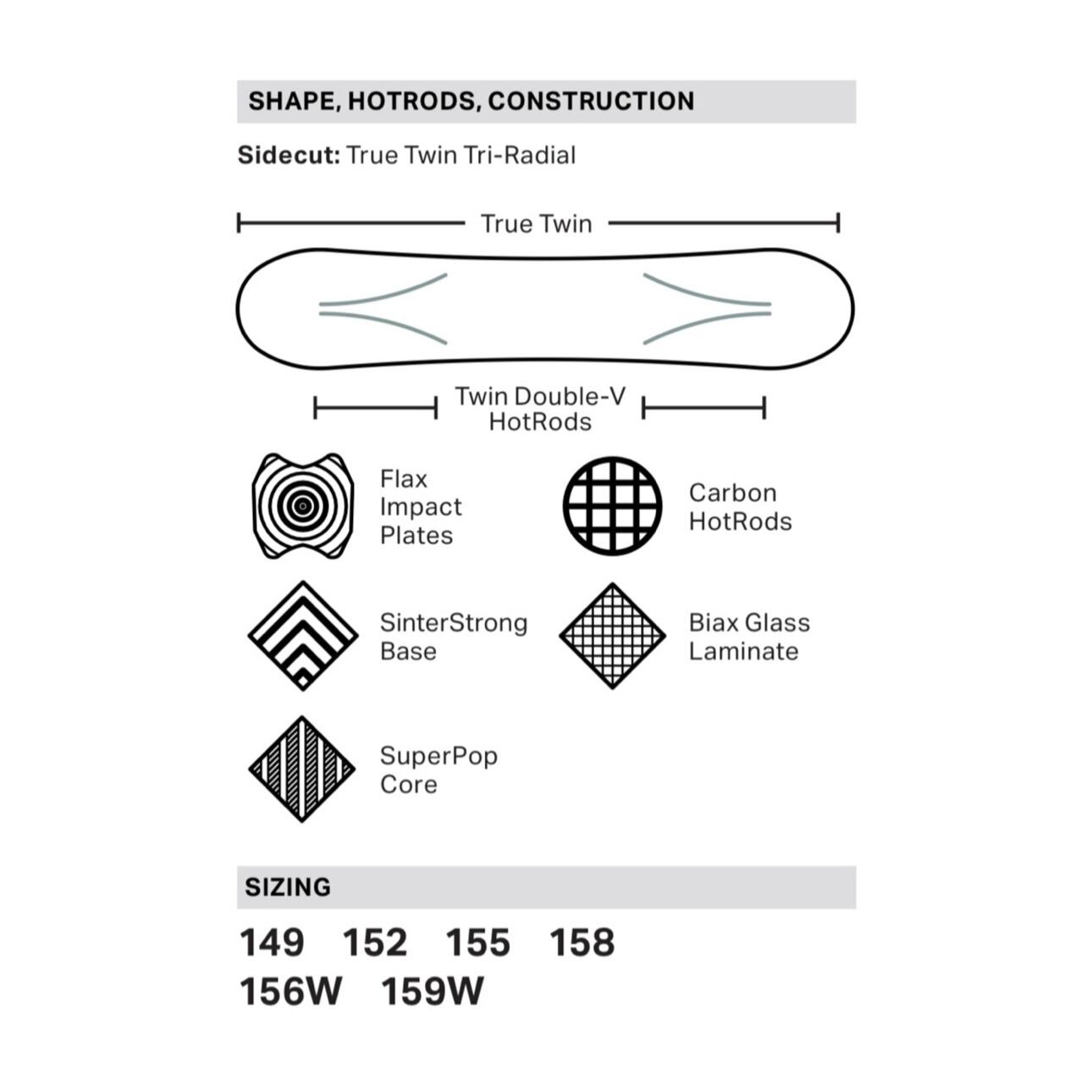 サイドカット、フレックスパターン、ノーズ/テールの長さ等のスペックが完全にシンメトリーなボード。トゥルーツイン・ボードはフリースタイル・ライディングやこれからうまくなろうというライダー向け