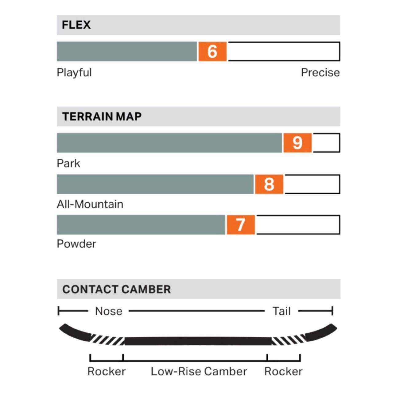 Party Modは、メローなライディング・スタイルながらもレスポンス良く動くボードを求めるライダーのために作られた。プレスをロックし、グラブをトゥイークしたいライダーのためのボードで、新しいコンタクトキャンバー・プロファイルと他にはないホットロッドの配置が、山全体を軽快に滑走させる。