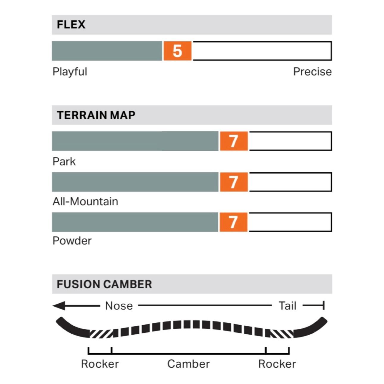 ノーズとテールが徐々に立体的に持ち上がっていく3D 形状がプレイフルなレスポンスとターン始動時のスピードをもたらし、エッジからエッジのレスポンスが安定する。ライダーを成長させるボード・モデルにも使われており、ライディング中に必要以上のエッジが引っ掛からない。