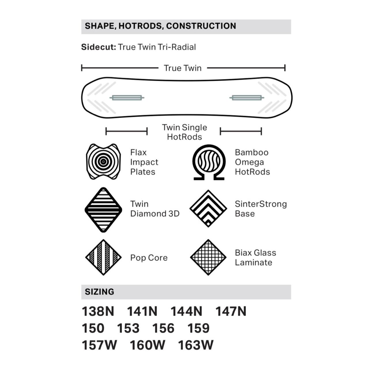 サイドカット、フレックスパターン、ノーズ/テールの長さ等のスペックが完全にシンメトリーなボード。トゥルーツイン・ボードはフリースタイル・ライディングやこれからうまくなろうというライダー向け