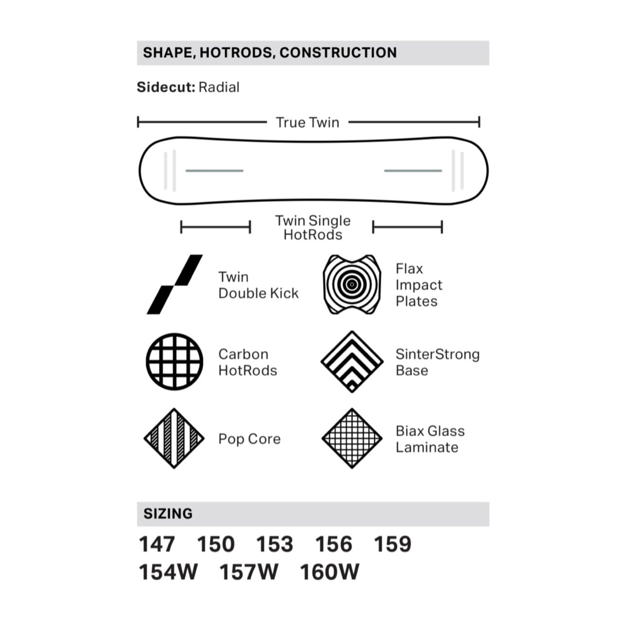 最高の反発力があり、より大きなフィーチャーの攻略、キレのあるフロントボードや高いノーリーに対応するスーパーポップで信頼性の高いツインボード。ステイポジティブ・キャンバー、カーボン・ホットロッド、ツイン・ダブルキックなどのテクノロジーを搭載したArtifact Proは、何日乗ってもポップだ。