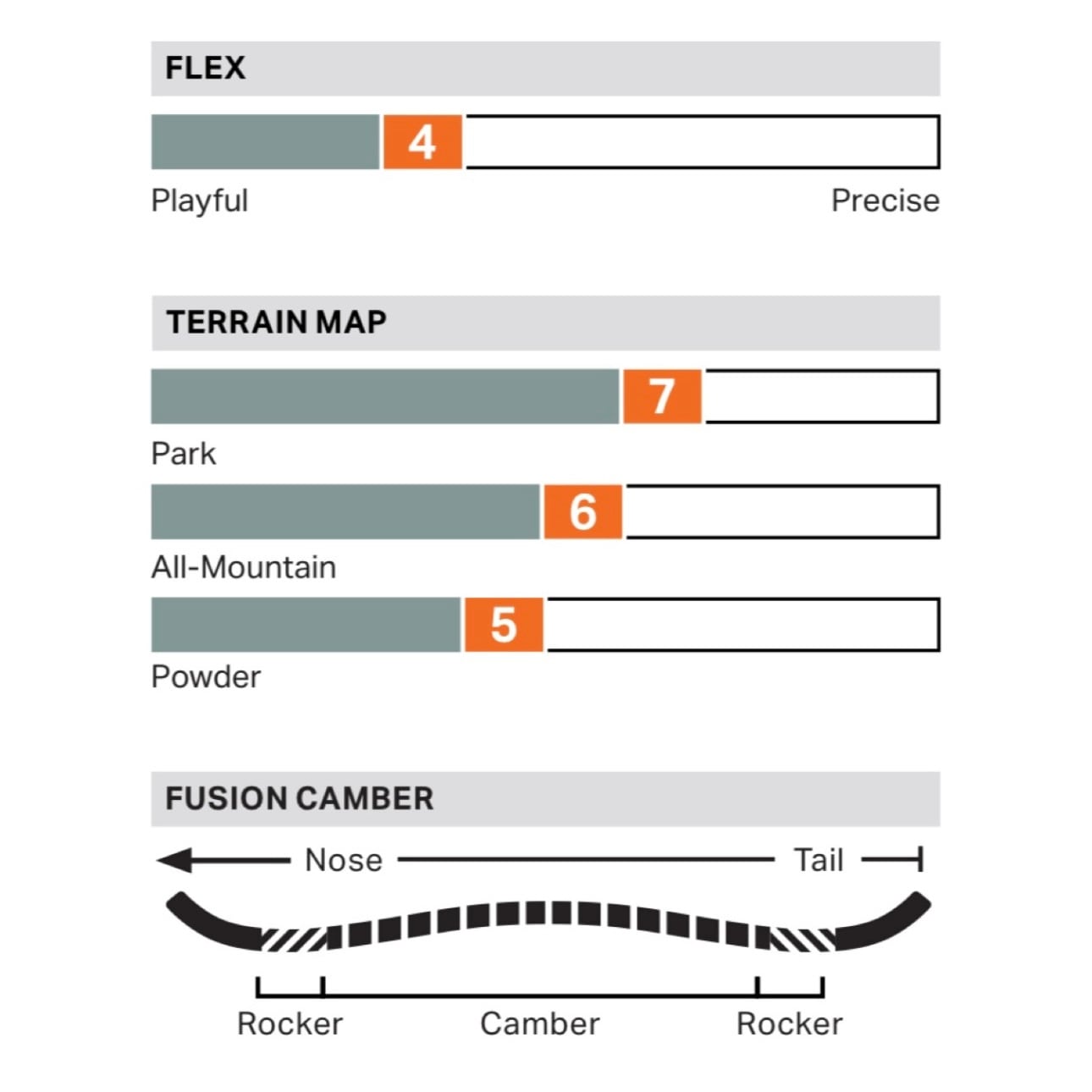 サイドカット、フレックスパターン、ノーズ/テールの長さ等のスペックが完全にシンメトリーなボード。トゥルーツイン・ボードはフリースタイル・ライディングやこれからうまくなろうというライダー向け。