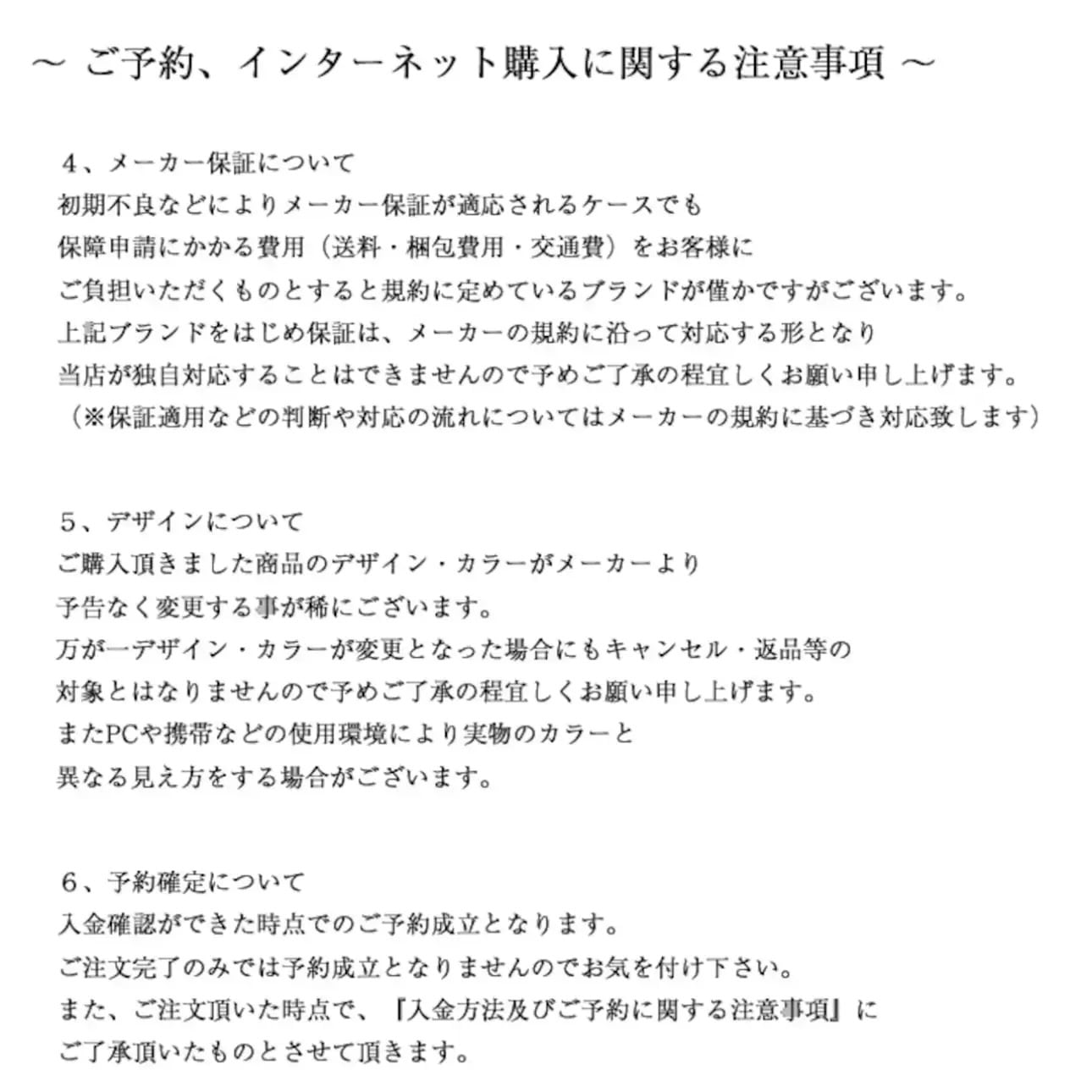 ◇ 对于通过银行转账付款的客户,即使在BASE上显示有库存,也可能已经在实体店完成销售。因此,在收到店铺的库存确认邮件之前,请不要进行付款。