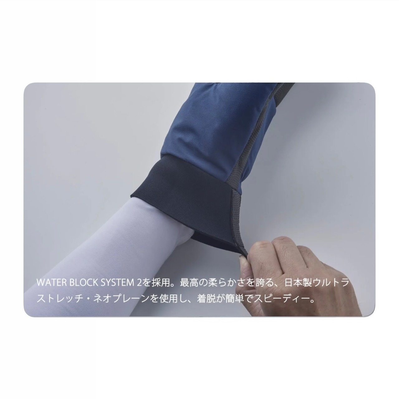 ・ WATER BLOCK SYSTEM 2を採用。最高の柔らかさを誇る、日本製ウルトラストレッチ・ネオプレーンを使用し、着脱が簡単でスピーディー。