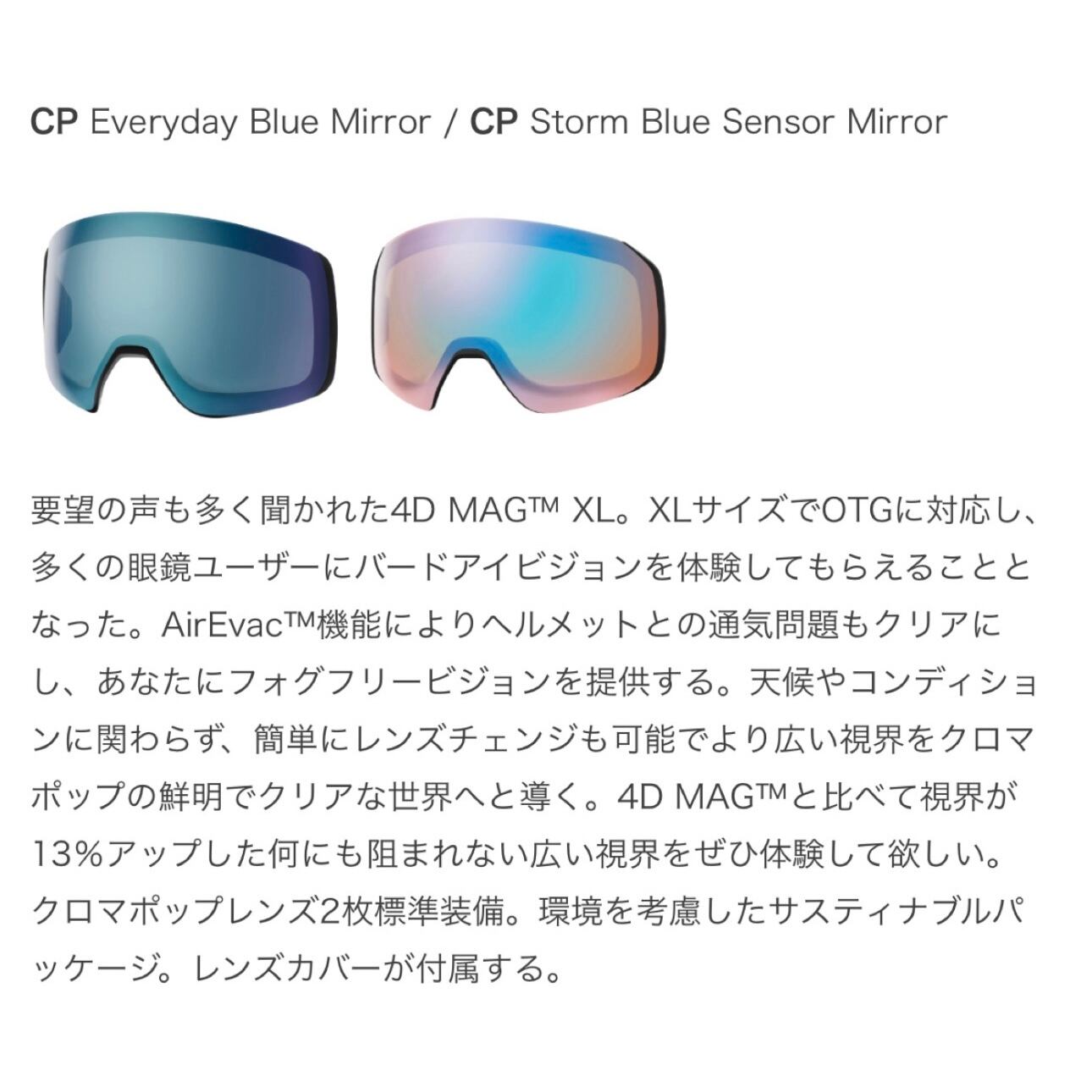 要望の声も多く聞かれた4D MAG™ XL。XLサイズでOTGに対応し、多くの眼鏡ユーザーにバードアイビジョンを体験してもらえることとなった。AirEvac™機能によりヘルメットとの通気問題もクリアにし、あなたにフォグフリービジョンを提供する。天候やコンディションに関わらず、簡単にレンズチェンジも可能でより広い視界をクロマポップの鮮明でクリアな世界へと導く。4D MAG™と比べて視界が13%アップした何にも阻まれない広い視界をぜひ体験して欲しい。クロマポップレンズ2枚標準装備。環境を考慮したサスティナブルパッケージ。レンズカバーが付属する。