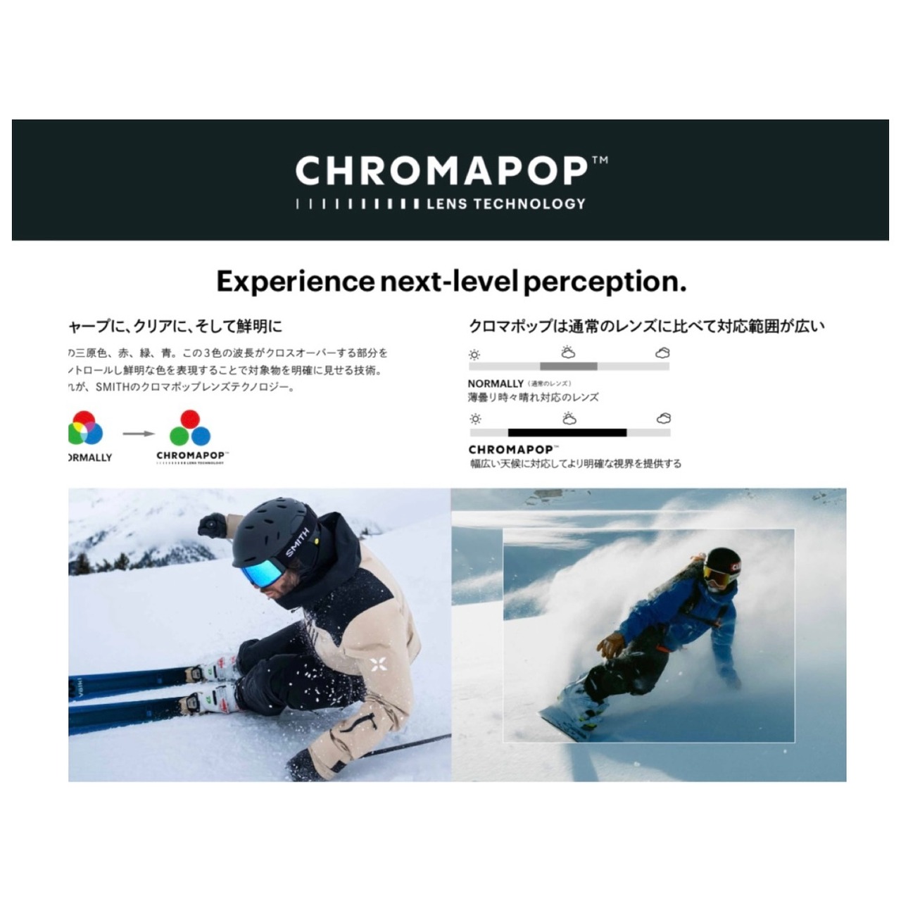 バードアイビジョンが今まで見えなかった視界を手に入れ、世界最高の視界を支えるクロマポップレンズが、クリアで広い視界を確保する。フォグフリービジョンを可能にするAirEvac™機能でヘルメットとの究極なインテグレーションを生む。SMITH MAGレンズチェンジシステムを搭載した独自のセキュリティー構造によって安全かつ簡単にレンズを着脱できるため、天候やコンディションの変化に応じて瞬時にレンズを交換できる。