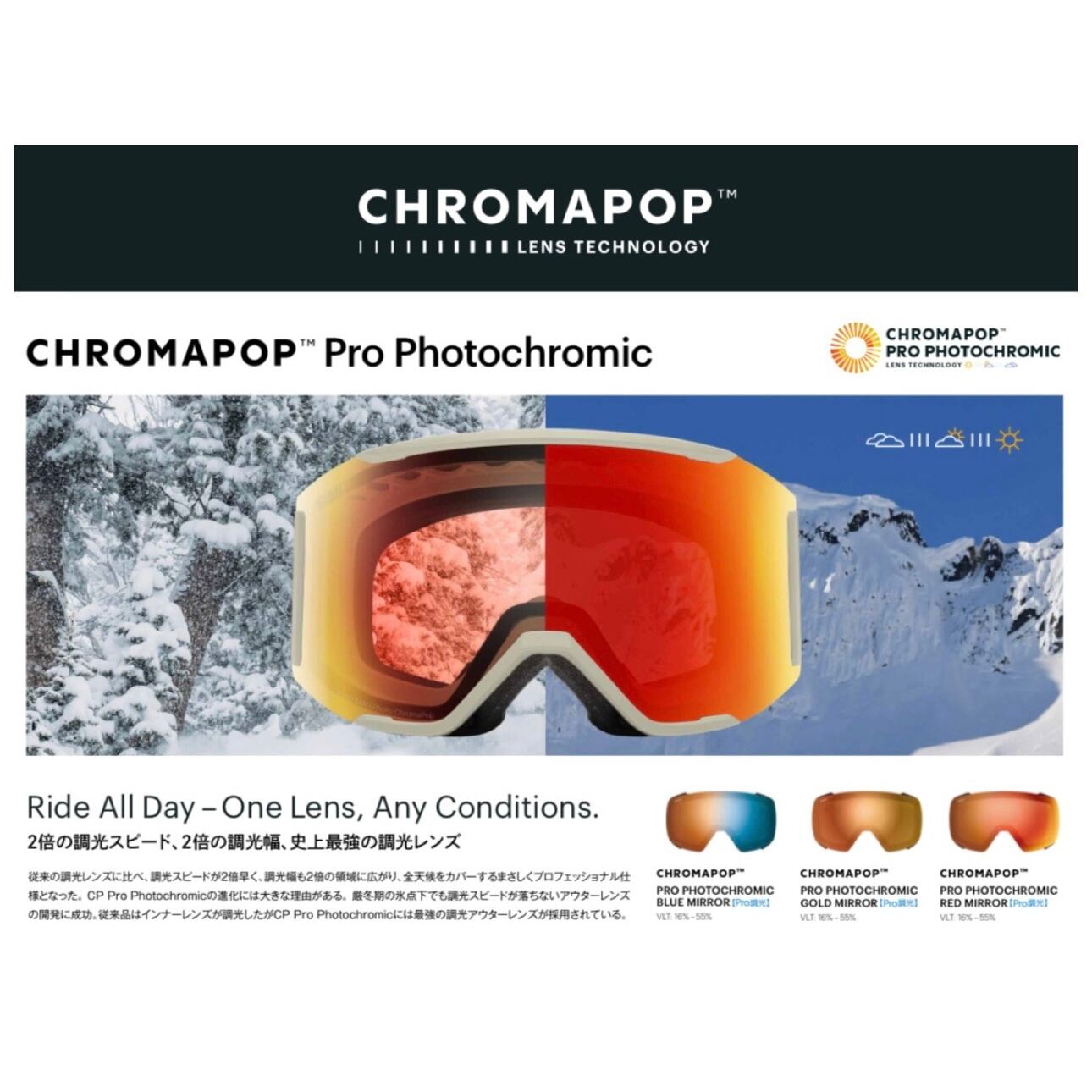 SMITH MAG™レンズチェンジシステムを搭載したインターチェンジブルゴーグル。独自のマグネットシステムとレンズセキュリティシステムを採用。顔全体を包み込む完璧なフィットを求めたミディアムサイズフレームを採用。フォグフリービジョンを可能にするAir Evac™機能でヘルメットとの究極なインテグレーション。最大限の視界を確保するラージサイズの球面レンズには5X™アンチフォグテクノロジーを装備。一切無駄のないコンパクトな構造がマグネットゴーグルとは思えない軽さを実現。1枚で全天候に対応できる史上最強のCP Pro PhotochromicレンズをBlackに採用。