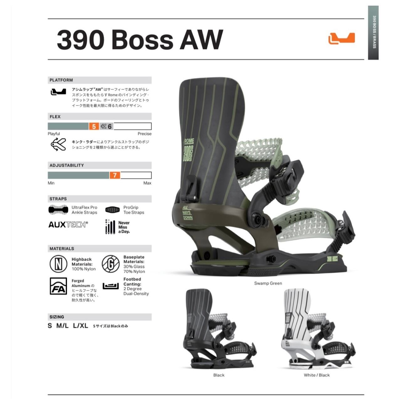 390 Boss AWはメロウなフレックスの多用途に使えるバインディング。様々なライディング·スタイルに合った質の高いバインディングを求めるライダーのために作られ、パウダーの朝で始まりハードに滑る午後のような日でも、朝のグルーミングから仲間と一緒にパークを滑り倒す午後のような日でも390 Boss AWなら問題なし。