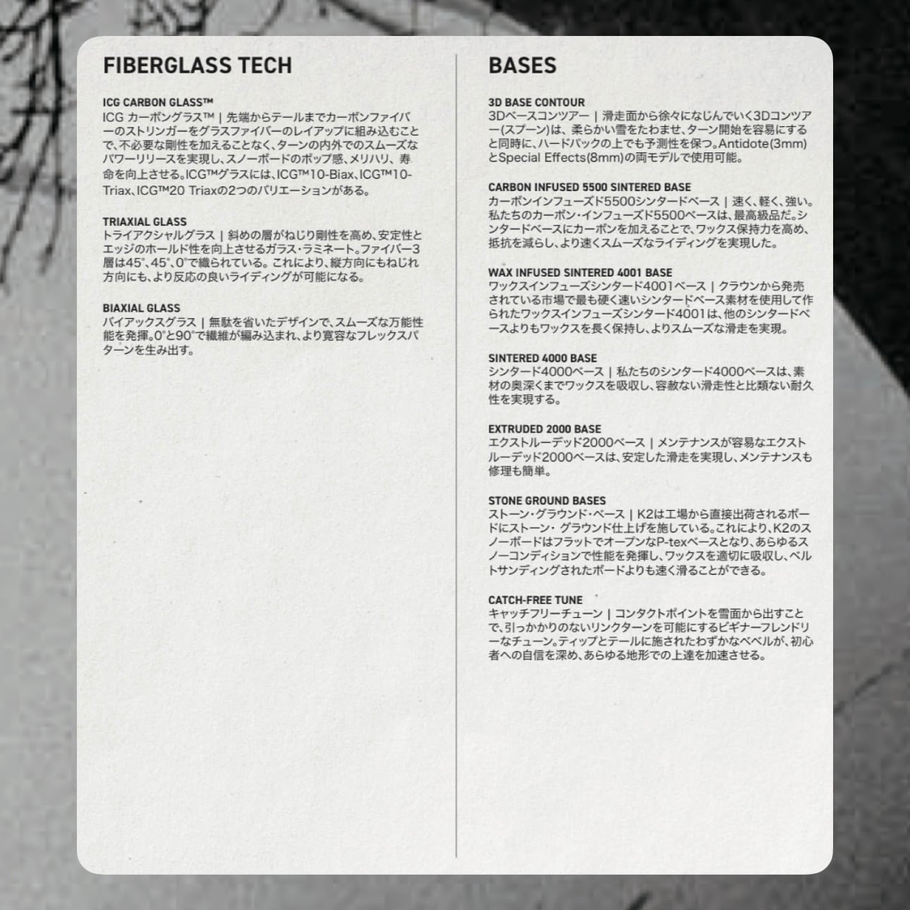 ・ICG カーボングラス™:先端からテールまでカーボンファイバーのストリンガーをグラスファイバーのレイアップに組み込むことで、不必要な剛性を加えることなく、ターンの内外でのスムーズなパワーリリースを実現し、スノーボードのポップ感、メリハリ、寿命を向上させる。ICG™グラスには、ICG™10-Biax、ICG™10Triax、ICG™20 Triaxの2つのバリエーションがある。
