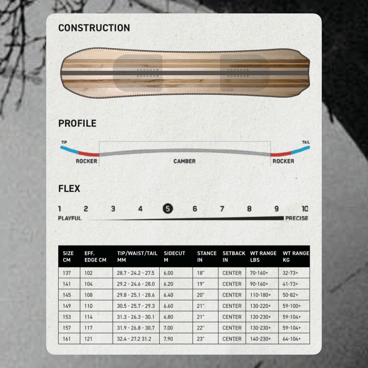 新登場のアルマナックはパーティープラッターやエクスカベーターといったモデルからインスピレーションを受け独自の道を切り開いたボリュームシフト™ボードの最新章。太めのボード幅でディープな日でも浮力を楽しむことができる。足元のキャンバーと、ノーズとテールの深めのロッカーによるゲレンデ全域での快適な滑走性能。ターンの出入りで十分なパワーを感じるスナップがあり、エッジ からエッジへと流れるようなフィーリングでゲレンデ全体を楽しめる。長さは普段より5cmほどのサイズダウンがお勧め。