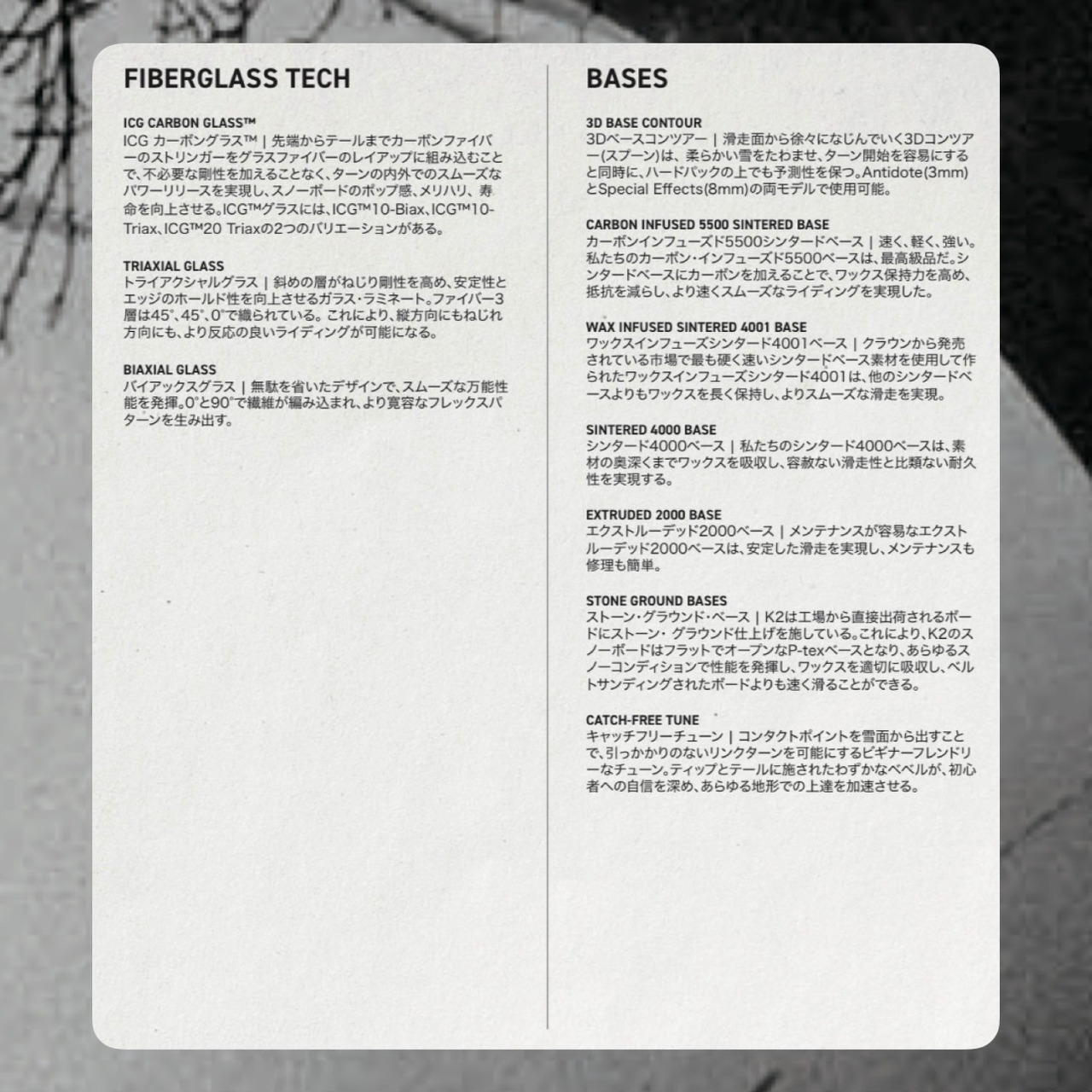 ・ICG カーボングラス™:先端からテールまでカーボンファイバーのストリンガーをグラスファイバーのレイアップに組み込むことで、不必要な剛性を加えることなく、ターンの内外でのスムーズなパワーリリースを実現し、スノーボードのポップ感、メリハリ、 寿命を向上させる。ICG™グラスには、ICG™10-Biax、ICG™10Triax、ICG™20 Triaxの2つのバリエーションがある。