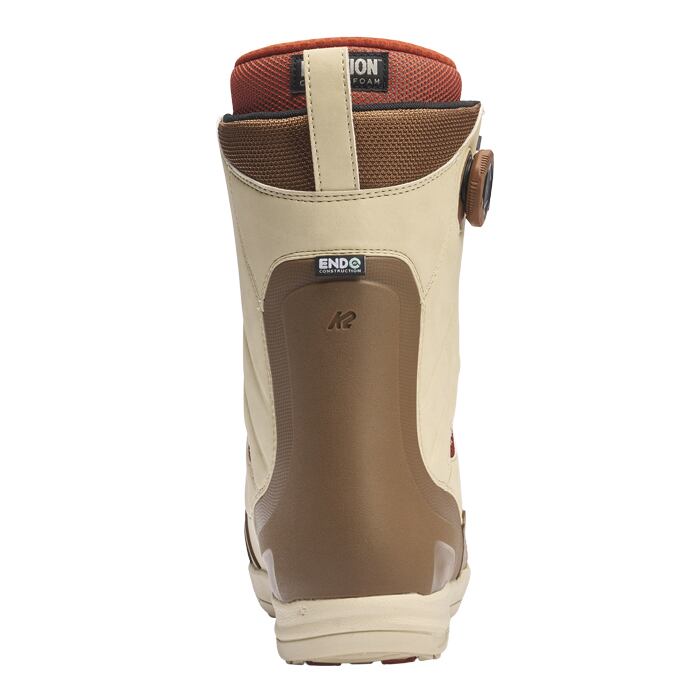 ・ENDO™ 3.0 構造 | K2スノーボーディング独自のEndoTM構造は、余分な素材を追加することなく(余分な素材=余分な重量)、スノーボードブーツのフレックス、レスポンス、反発を変えることができる。インジェクション・ヒールカウンターで余分な素材 を置き換えることで、フォーミュラを変更するのと同じくらい簡単に反発力を追加す ることができ、より安定したフレックスで長持ちするスノーボードブーツを提供することができる。