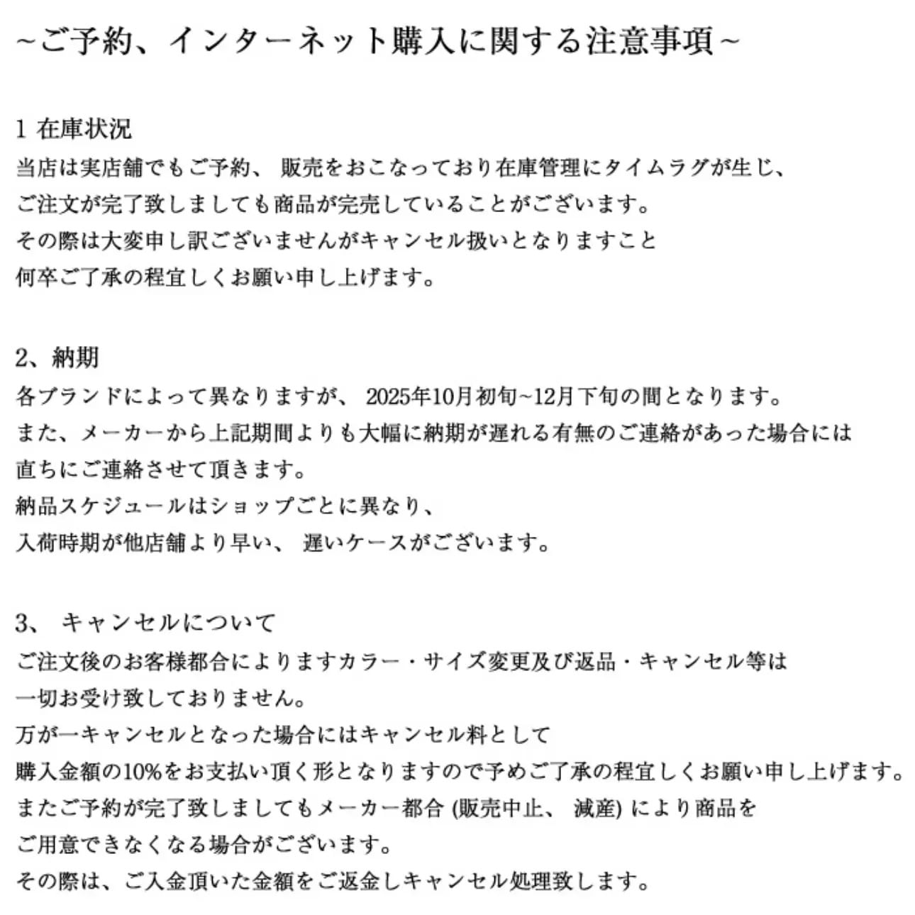Our store also processes reservations and sales in our physical store, which may cause a time lag in inventory management. As a result, even if your order is completed, there may be instances where the product is sold out. In such cases, we sincerely apologize, and your order will be treated as a cancellation. We kindly ask for your understanding and cooperation.