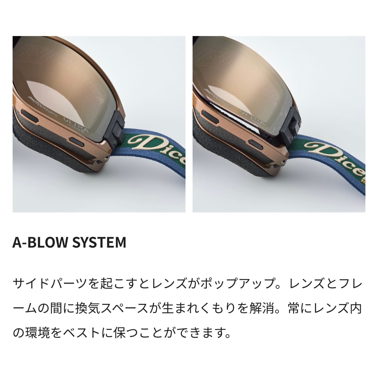 DICEの代名詞となったゴーグル内換気システム「A-BLOW SYSTEM」を採用した平面レンズモデル。圧倒的な視野の広さと日本人に最適な抜群のフィット感で、今までに経験したことのない新しいゴーグル体験を提供します。