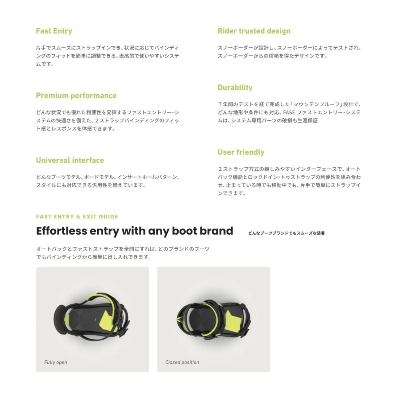 革新的なFASE Fast Entry System(FASE ファストエントリー・システム)の鍵となるAutobackは、ハンズフリーでバインディングにエントリーできます。この直感的なデザインは、ブーツをバインディングに入れると自動的に閉じ、ブーツを持ち上げると開きます。またスケーティングやリフト、収納時はフラットに折りたたむことができます。