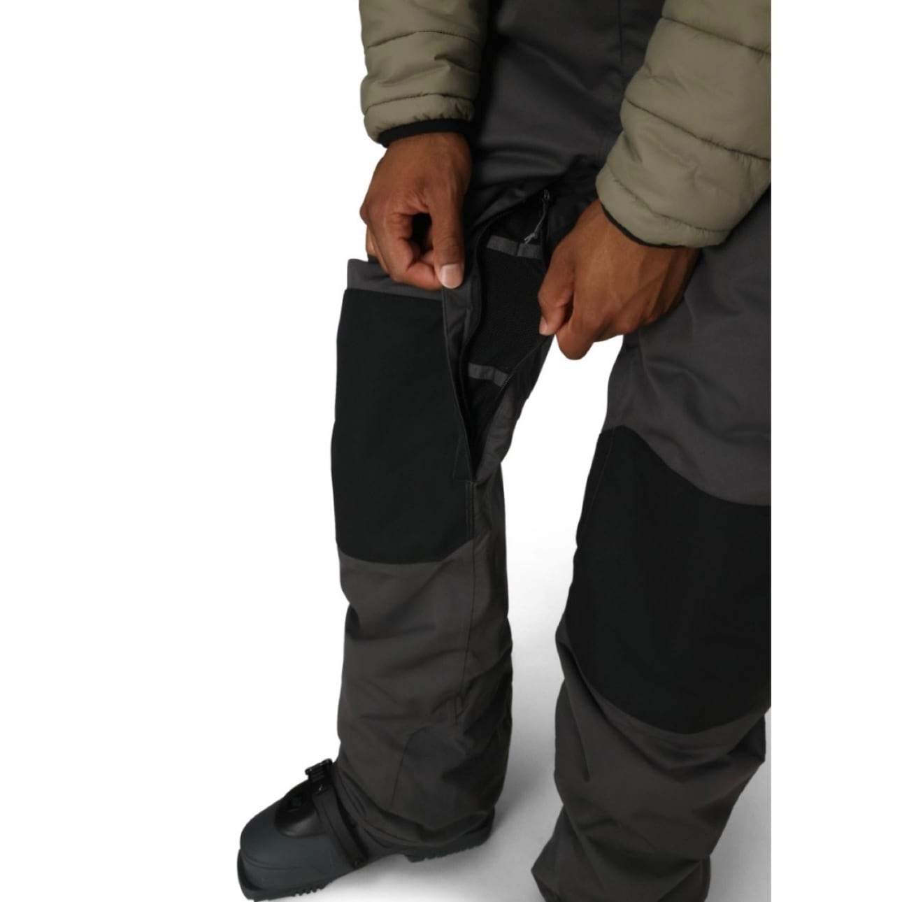 両足部分だけインサレーション入りで上部はシェル仕様となっています。ショルダーストラップや脇腹のパネルはストレッチが効いてきてノンストレスに着用出来ます。胸元にはスマートフォンや小銭入れ等が入る収納力抜群のジッパー付きポケットがあり、耐水圧・透湿性はしっかりとあるのでパウダーを楽しむユーザにもオススメです。