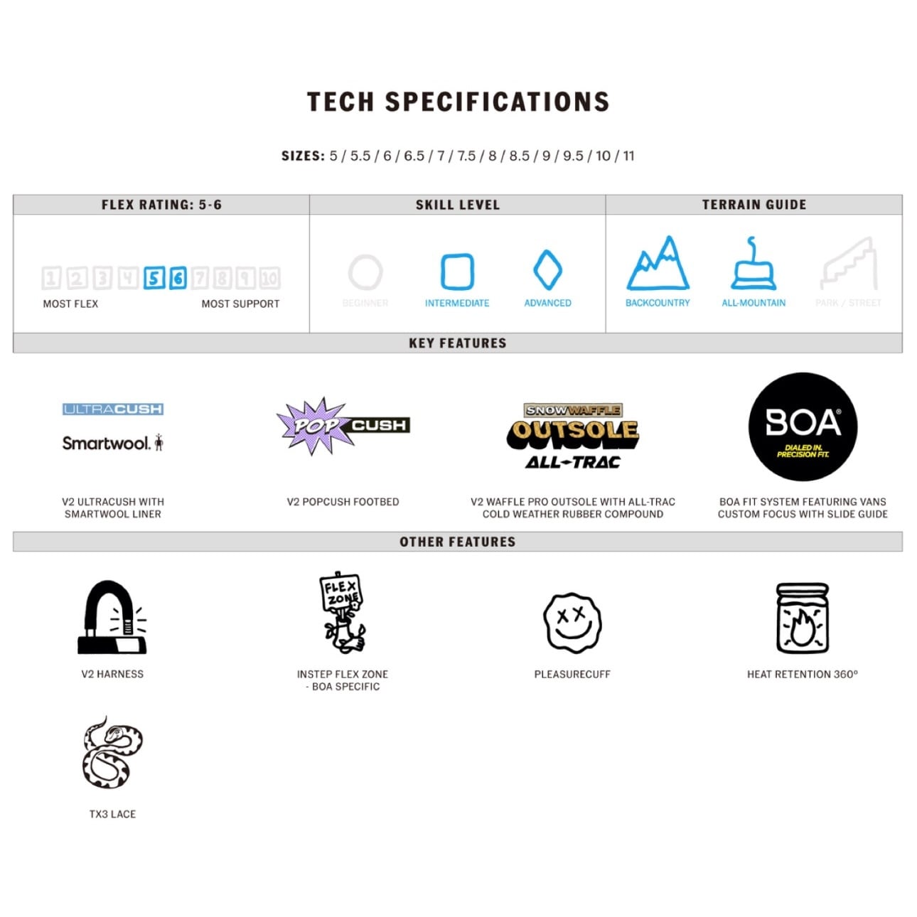 デュアルゾーンBOA®フィットシステムにVansカスタムフォーカスを採用し、無限のオンザフライ微調整が可能。さらにカスタム・スライド・ガイドによるカスタマイズ可能な快適性とヒールホールドが特徴です。さらにV2 UltraCush™ Smartwool®ライナーとV2 POPCUSH™ フットベッドを組み合わせることで、Encore Proはスノーボードの新たなスタンダードとなるかもしれません。