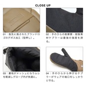 カービングに特化して開発したNEWモデル「CARVER」。雪面との摩擦にも耐えられるよう、耐摩擦・耐裂素材のケブラーを手のひらからロングカフまで使用し、耐久性を確保。グローブはもちろんのこと、ウェアの袖口もロングカフがしっかりとガードして守ります。