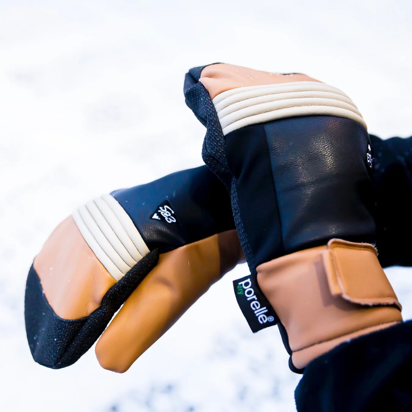・本革=摩擦や型崩れに強くやわらかい手触りが特徴のゴート革(山羊革)を使用しています。染色加工の際に防腐、防水材を混ぜており雪山でも使えば使うほどやわらかくしなやかになり手に馴染んでくれ革を育てるのもレザーグローブの醍醐味です。
