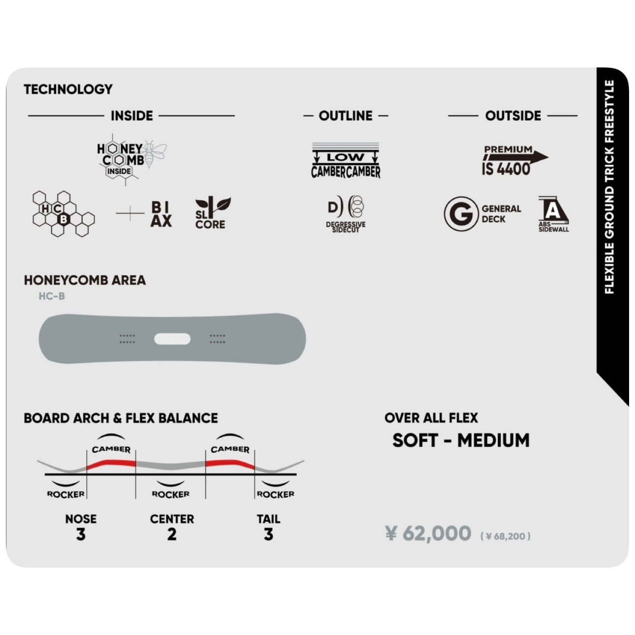 ■ DEGRESSIVE SIDECUT:センターからキック方向へ行くに従いRが小さくなるDEGRESSIVE SIDECUT。アプローチとランディングがどんどん入れ替わる乗り方をするライダーには、これ以上ないプロポーション。前後均等で、ターンやトリックのきっかけが作りやすく、抜けもよい、クセがなく、乗り手を選ばない。常にコンディションが変わる雪面状況に対応できるように設計されているので攻めたライディングで未来を切り開け!