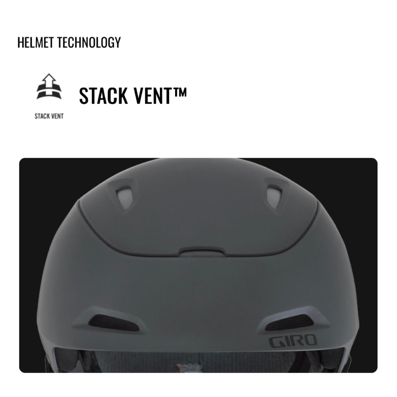 スタックベントはゴーグルのセンターベンチレーションから排気される、大量の暖かい空気によってゴーグルの曇りを引き起こす可能性があるという研究に基づいてGIROが独自に開発しました。ヘルメットのスタックベントをゴーグルのセンターベントと同調させることにより、視界をクリアで曇りのない状態に維持することができます。