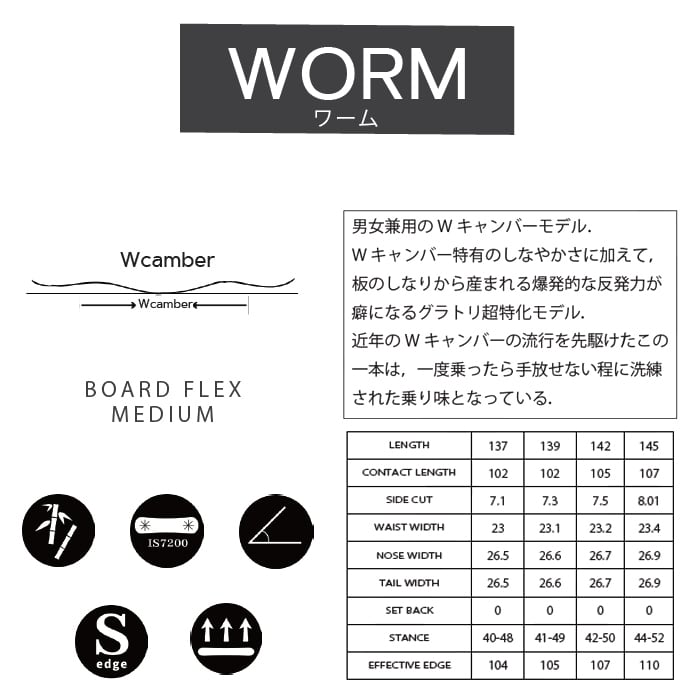 ➡ 男女兼用のW キャンバーモデル。W キャンバー特有のしなやかさに加えて、板のしなりから産まれる爆発的な反発力が癖になるグラトリ超特化モデル。