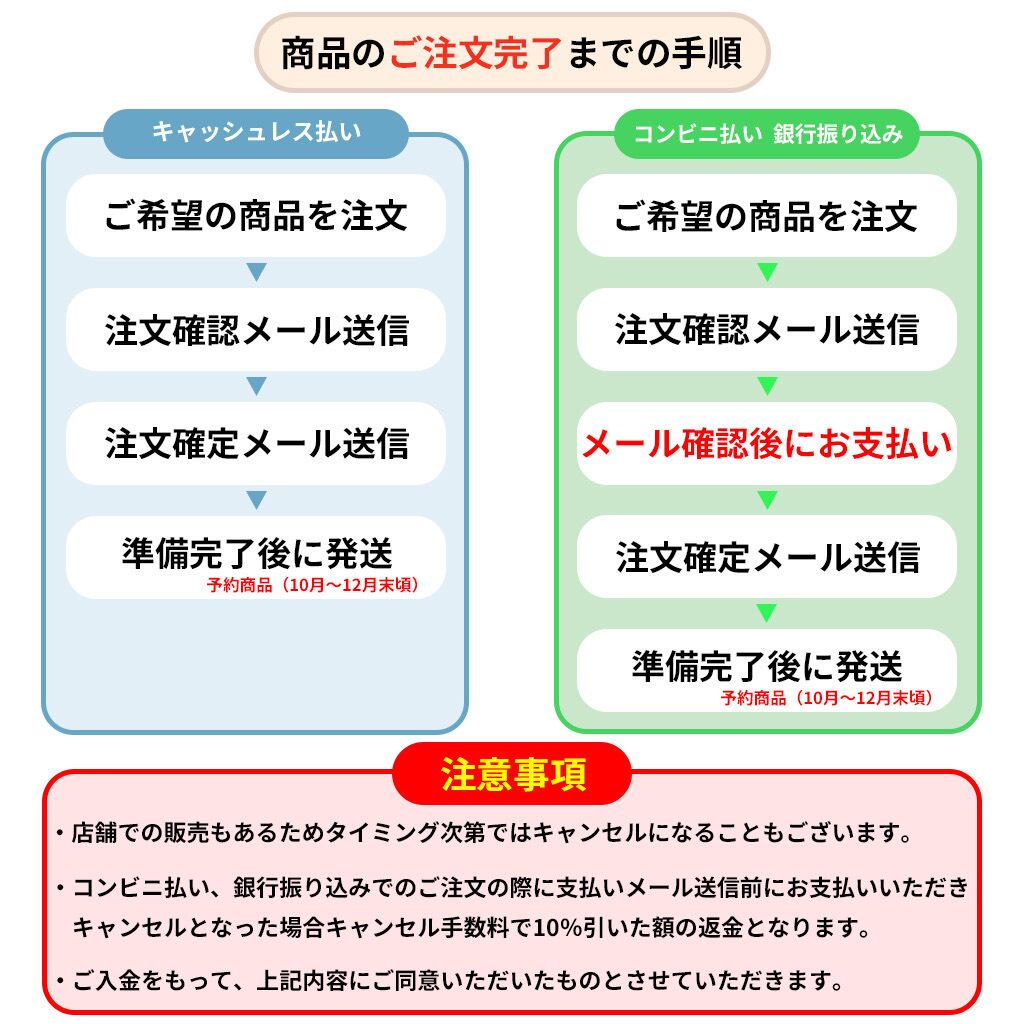 なお、ご注文確認メール送信前にご入金いただき、在庫が完売となっていた場合は、購入代金の10%を返金手数料として頂戴いたします。あらかじめご了承くださいませ。