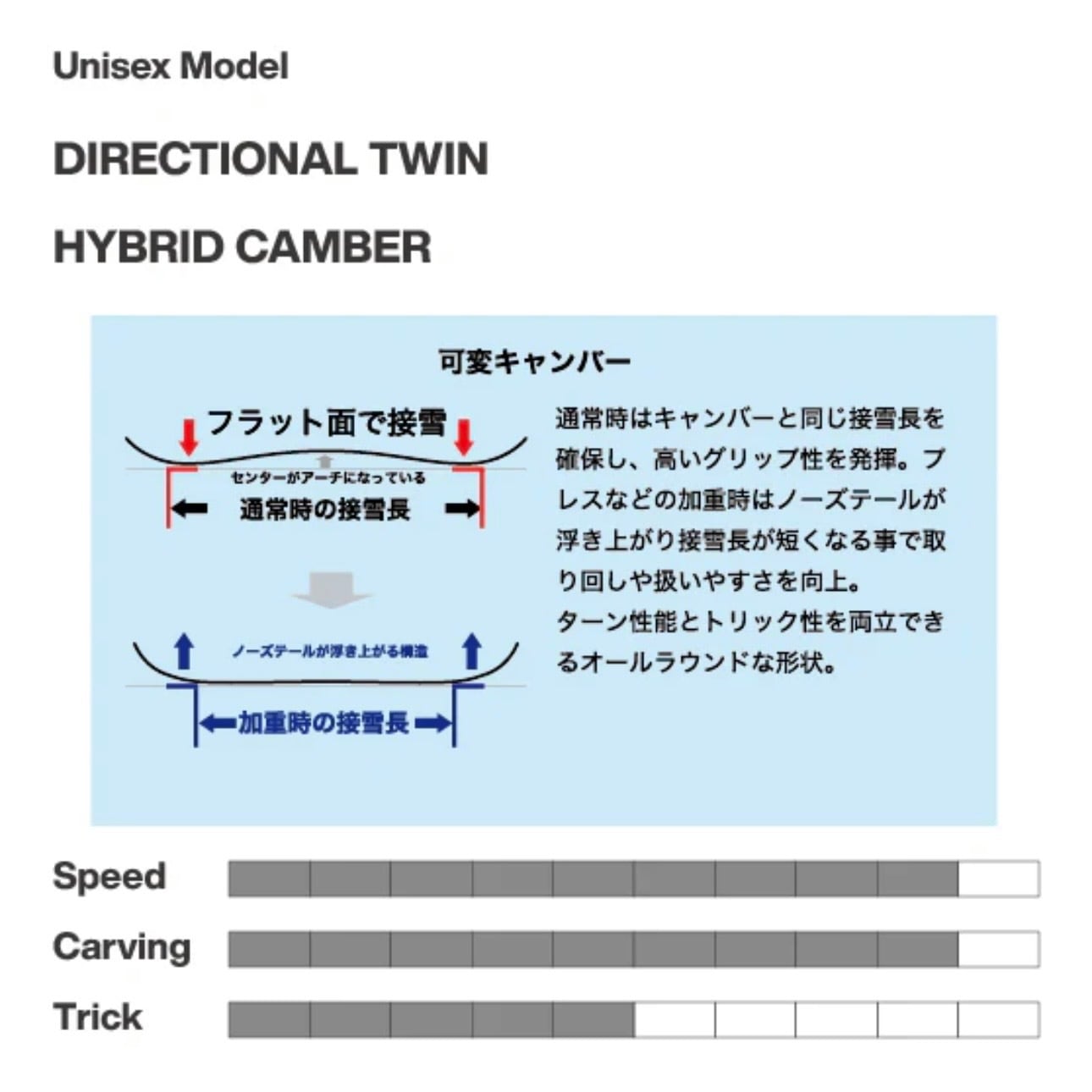 それぞれのモデル形状に合わせたボトム形状を採用することによりこれまでのスノーボードにない圧倒的な性能を最大限に発揮します。