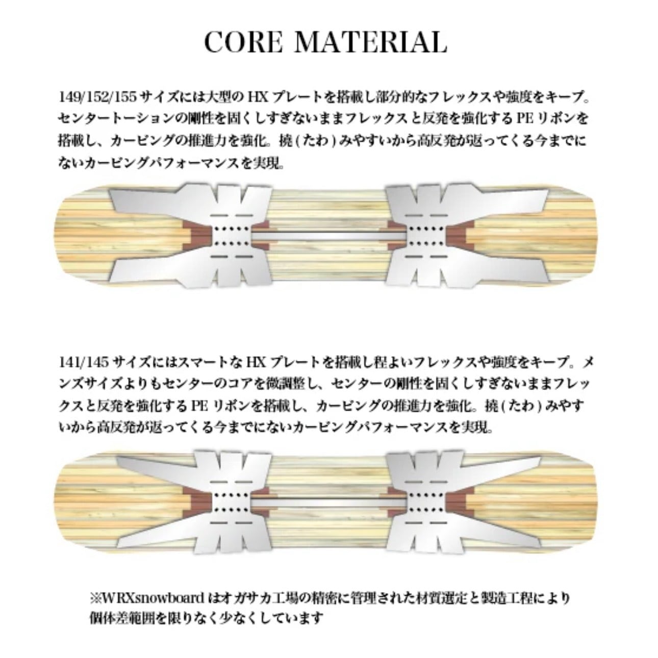 WRXsnowboardには全てオリジナルアウトラインが使用されています。ターンのしやすさとトリックのしやすさを追求し接雪長・有効エッジ・全長のバランスとウエストの太さからサイドカーブまで高いレベルでの全体最適を意識した独自の設計は乗ってターンをしたその瞬間に「これは別格だ」という確かなフィーリングが感じられます。