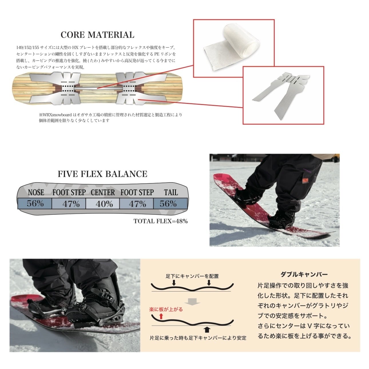 WRXsnowboardには全てオリジナルアウトラインが使用されています。ターンのしやすさとトリックのしやすさを追求し接雪長・有効エッジ・全長のバランスとウエストの太さからサイドカーブまで高いレベルでの全体最適を意識した独自の設計は乗ってターンをしたその瞬間に「これは別格だ」という確かなフィーリングが感じられます。