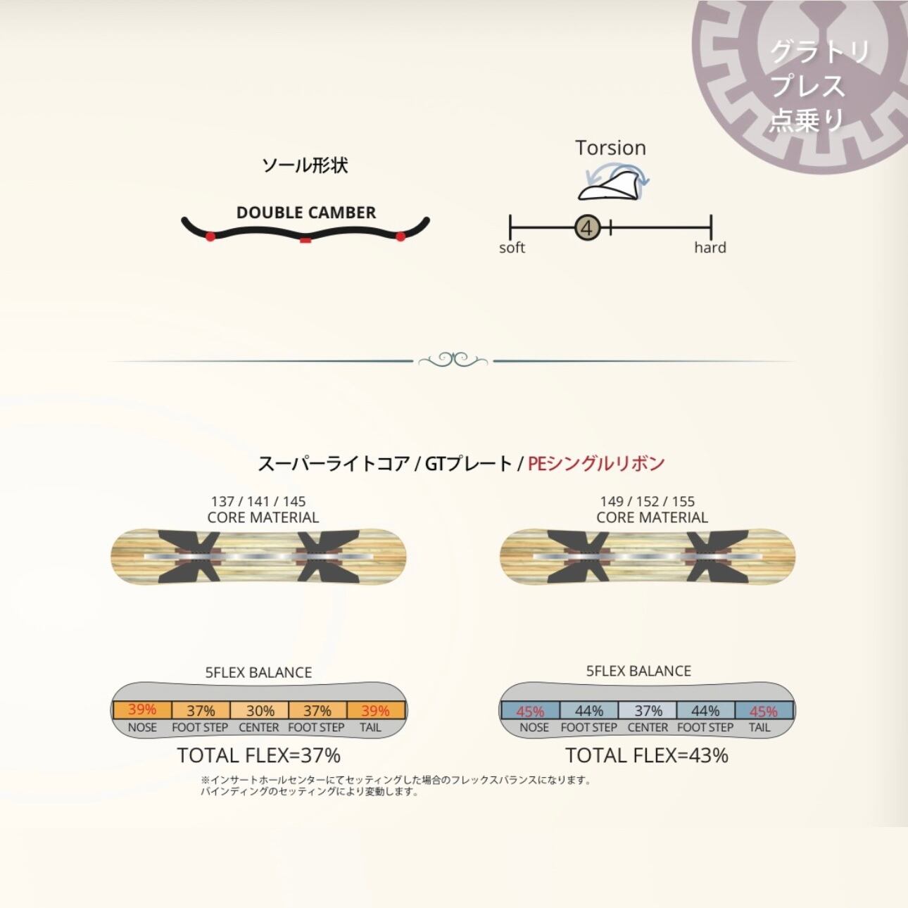 GT2は、ダブルキャンバー形状を採用し、操作性に優れたスノーボードです。新たにPEリボンを搭載した軽量かつ柔軟さをキープしたままトリック時の反発力をもたらします。