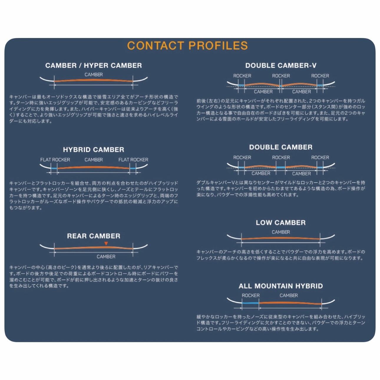 → キャンバーは最もオーソドックスな構造で接雪エリア全てがアーチ形状の構造です。ターン時に強いエッジグリップが可能で、安定感のあるカービングなどフリーライディングに力を発揮します。