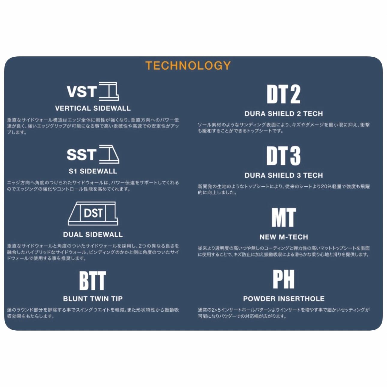 → キャンバーのアーチの高さを低くすることでパウダーでの浮力を高めます。ボードのフレックスが柔らかくなるので操作が楽になると共に自由な表現が可能になります。