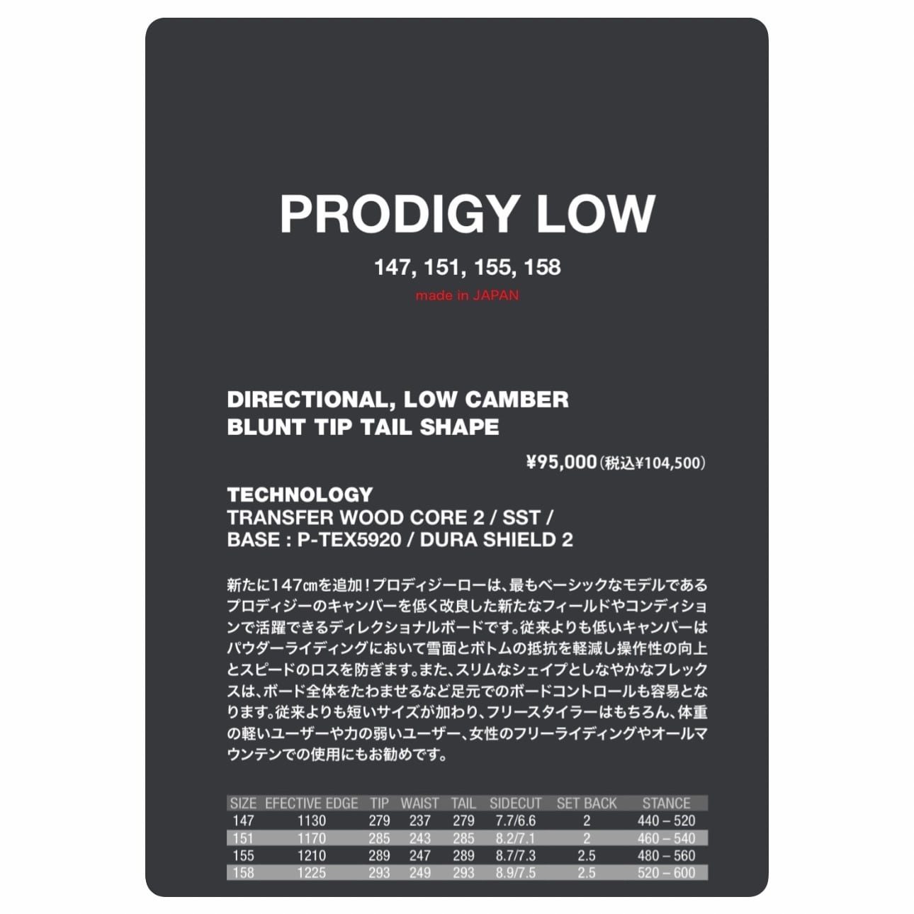 新たに147㎝を追加!プロディジーローは、最もベーシックなモデルであるプロディジーのキャンバーを低く改良した新たなフィールドやコンディションで活躍できるディレクショナルボードです。従来よりも低いキャンバーはパウダーライディングにおいて雪面とボトムの抵抗を軽減し操作性の向上とスピードのロスを防ぎます。また、スリムなシェイプとしなやかなフレックスは、ボード全体をたわませるなど足元でのボードコントロールも容易となります。従来よりも短いサイズが加わり、フリースタイラーはもちろん、体重の軽いユーザーや力の弱いユーザー、女性のフリーライディングやオールマウンテンでの使用にもお勧めです。