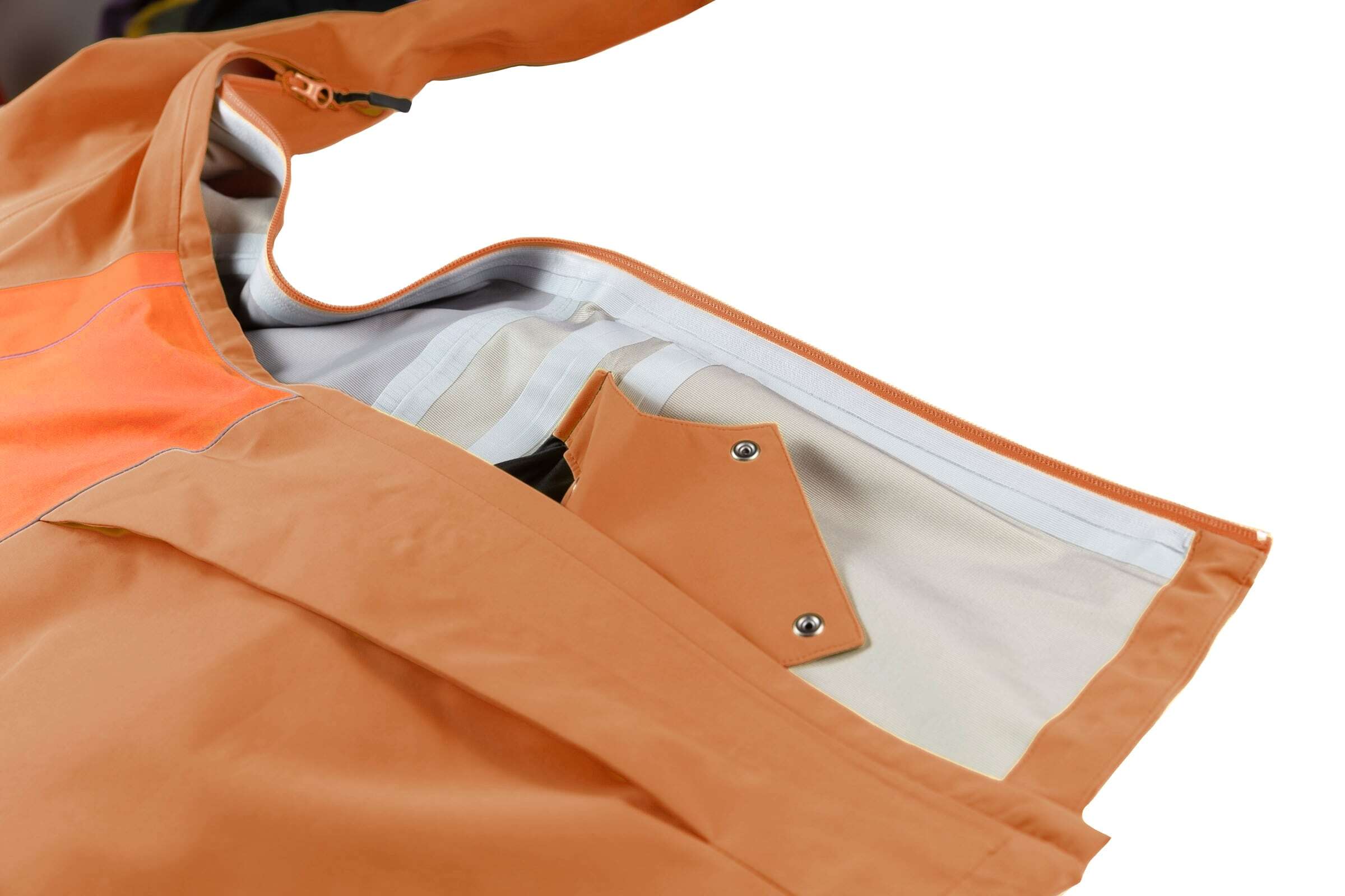 unfudgeのビブパンツと合わせることで、パンツ胸ポケットへ最小限の開口でアクセスできるスリットです。風や雪の激しい日にウェア内へと侵入する冷気を最小限に抑えます。