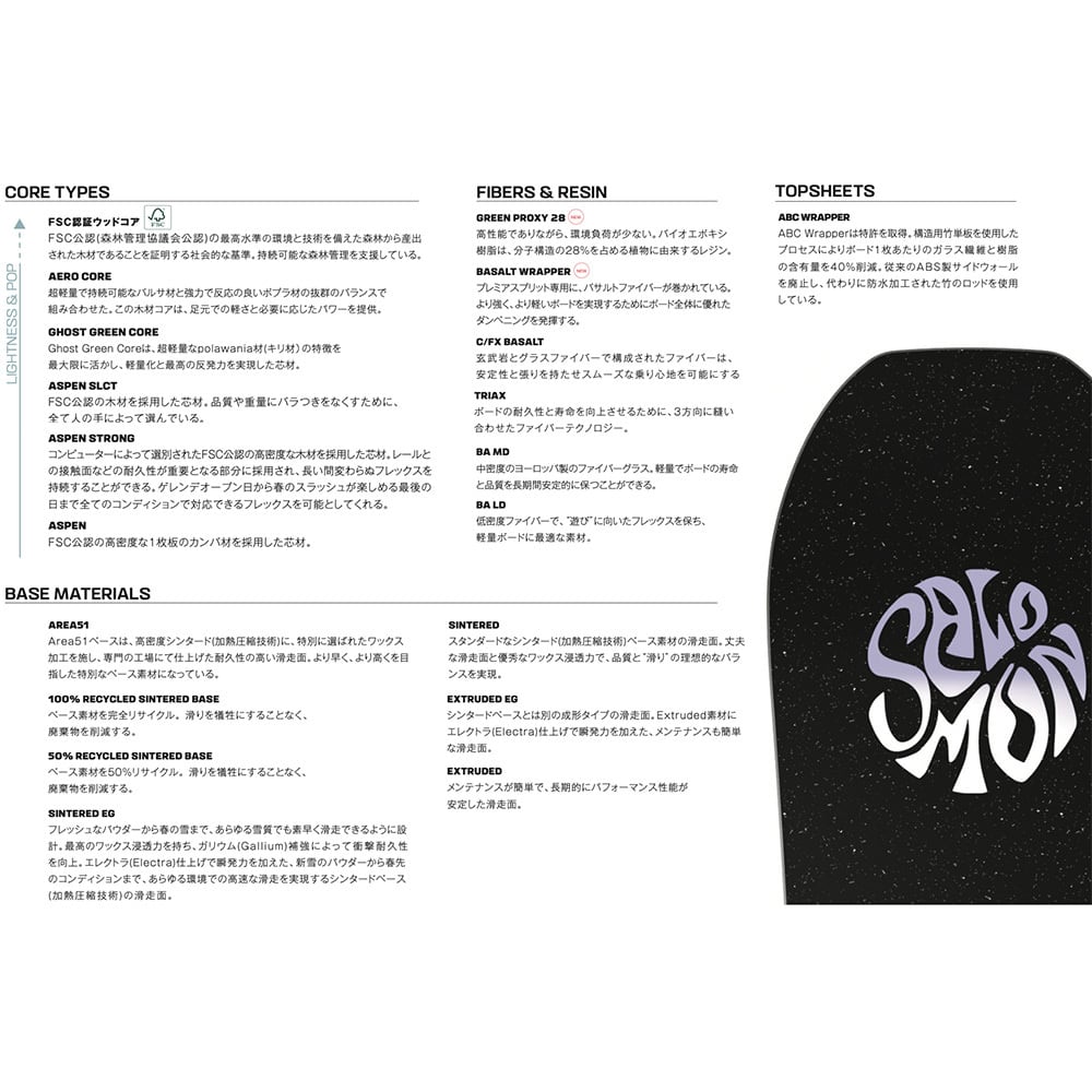 昨年に引き続き今年もFRONTIERのグラフィックは、SALOMON SNOWBOARDSジャパンDESIGNCHALLENGE2023-2024という企画で一般公募した中から選ばれたグラフィックを採用しています。フラットアウトキャンバー構造とバイトフリーエッジを採用することで、クリエイティブなライディングがよりイージーに。ディレクショナルツイン形状、アスペンコアが滑りに多彩さをプラス。すべての地形でフリースタイルに遊ぶことを追求したい人には、このFRONTIERがオススメです。