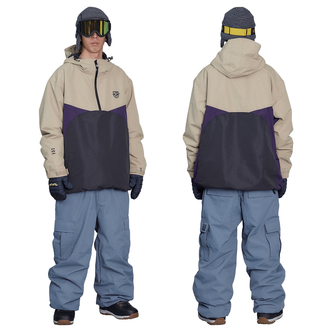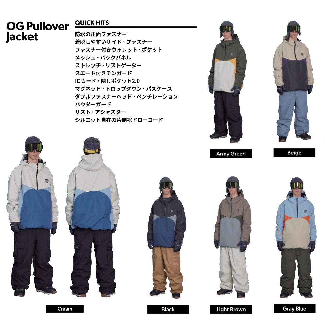 毎年人気配色のプルオーバージャケット。今年もさわやかな配色から渋い配色まで揃っています。合せるパンツによって派手にも大人しくも着こなせるところが嬉しいポイントです。また、機能面は正面からの雪の侵入を防ぐシームテープ。首まで守られる一体型フード、着脱が楽な脇までのサイドジップなどなど抜群です。ワンサイズ大きめでずるっと着用していただくのが流行りですね。