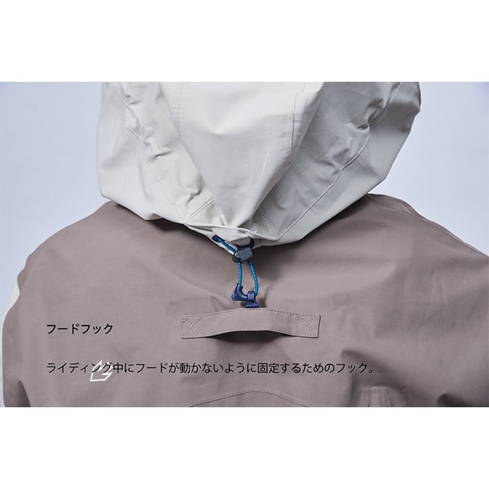 ライディング中にフードが動かないように固定するためのフック。