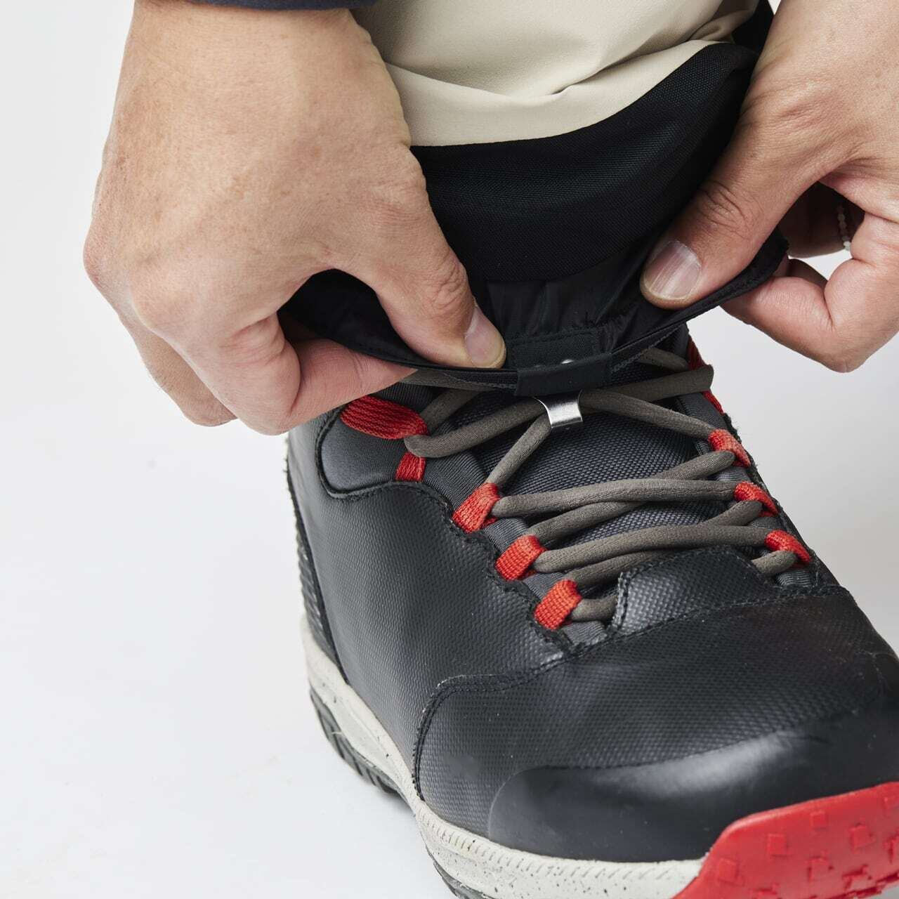 雪の侵入を防ぐため、ブーツに被せられるようゲーターを装備。また前部にフックがありブーツのヒモに掛けることでズレを防ぎます。